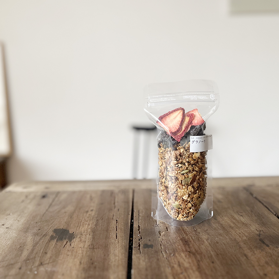メイプルシロップと米あめの優しい甘みのグラノーラに国産いちごとレーズンを合わせました。春限定の組み合わせです。