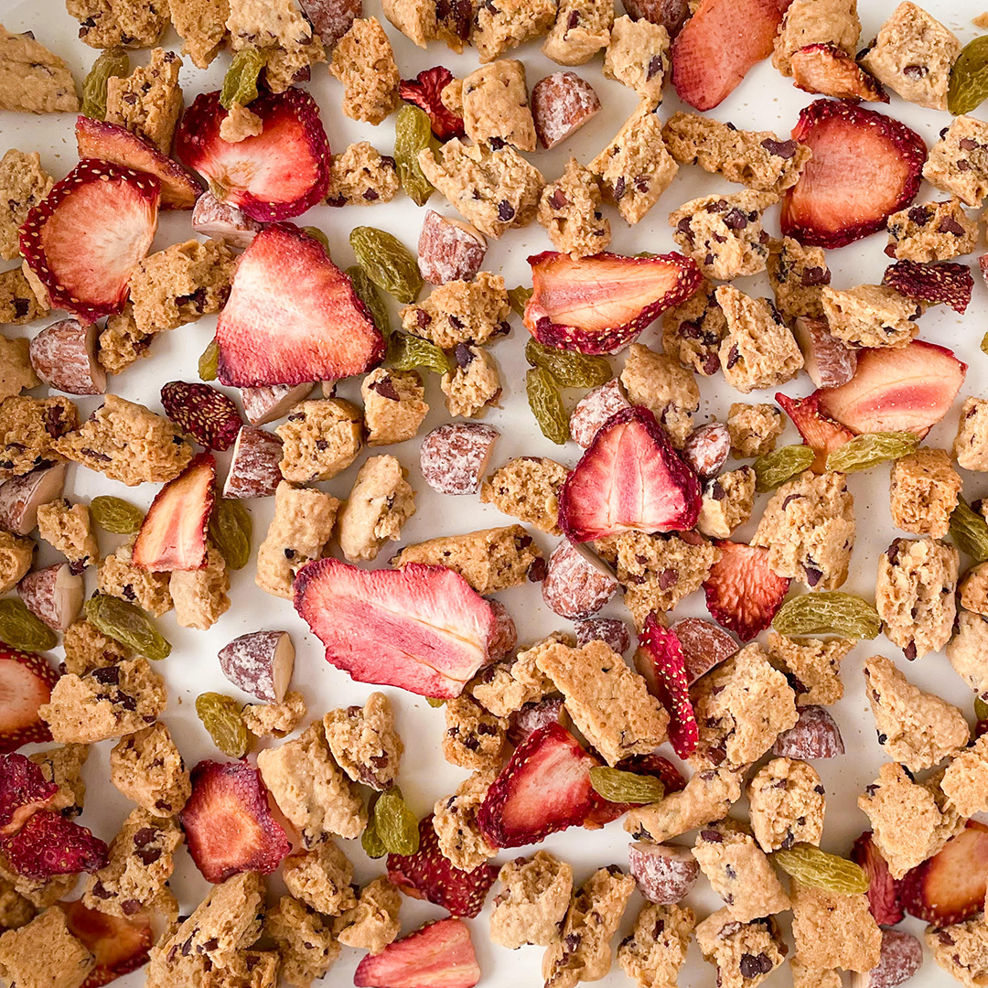 オートミール(オーストラリア製造)、小麦粉、きび糖、グリーンレーズン、アーモンド、菜種油、カカオニブ、ドライいちご(いちご)、塩