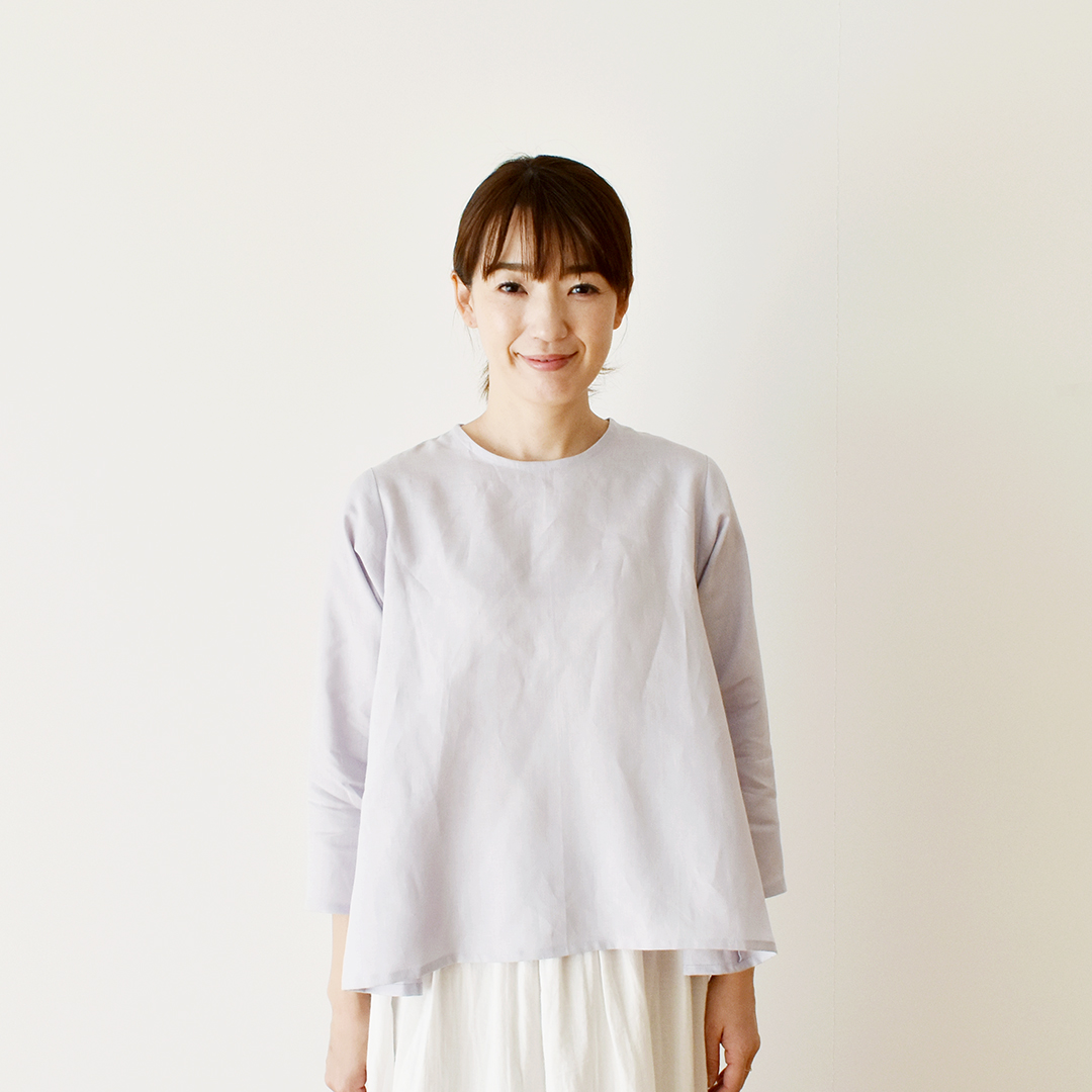 スモークライトラベンダー:『CHECK&STRIPE Sewing Diary in Paris パリのソーイングダイアリー』(世界文化社) サイドギャザーのワンピース(ブラウス丈にアレンジしています)