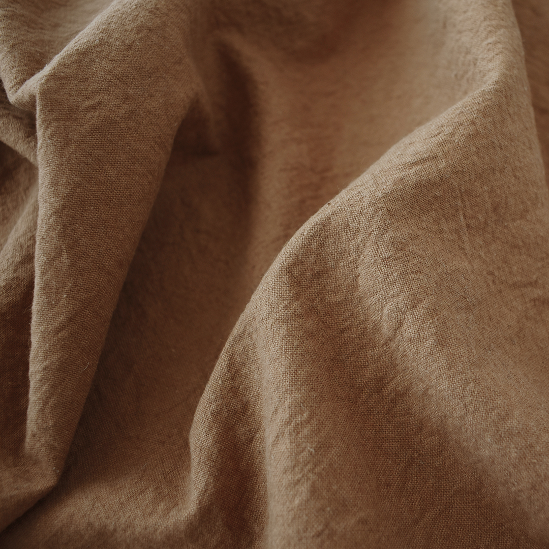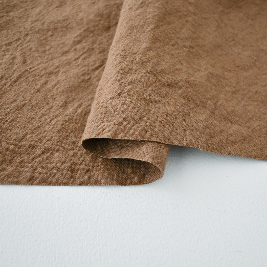 透け感のない、厚みのある、シワ加工を施したハーフリネンです。小さな窯でゆっくりと時間をかけて染め上げられる生地は、熟練した職人の手によって生まれます。