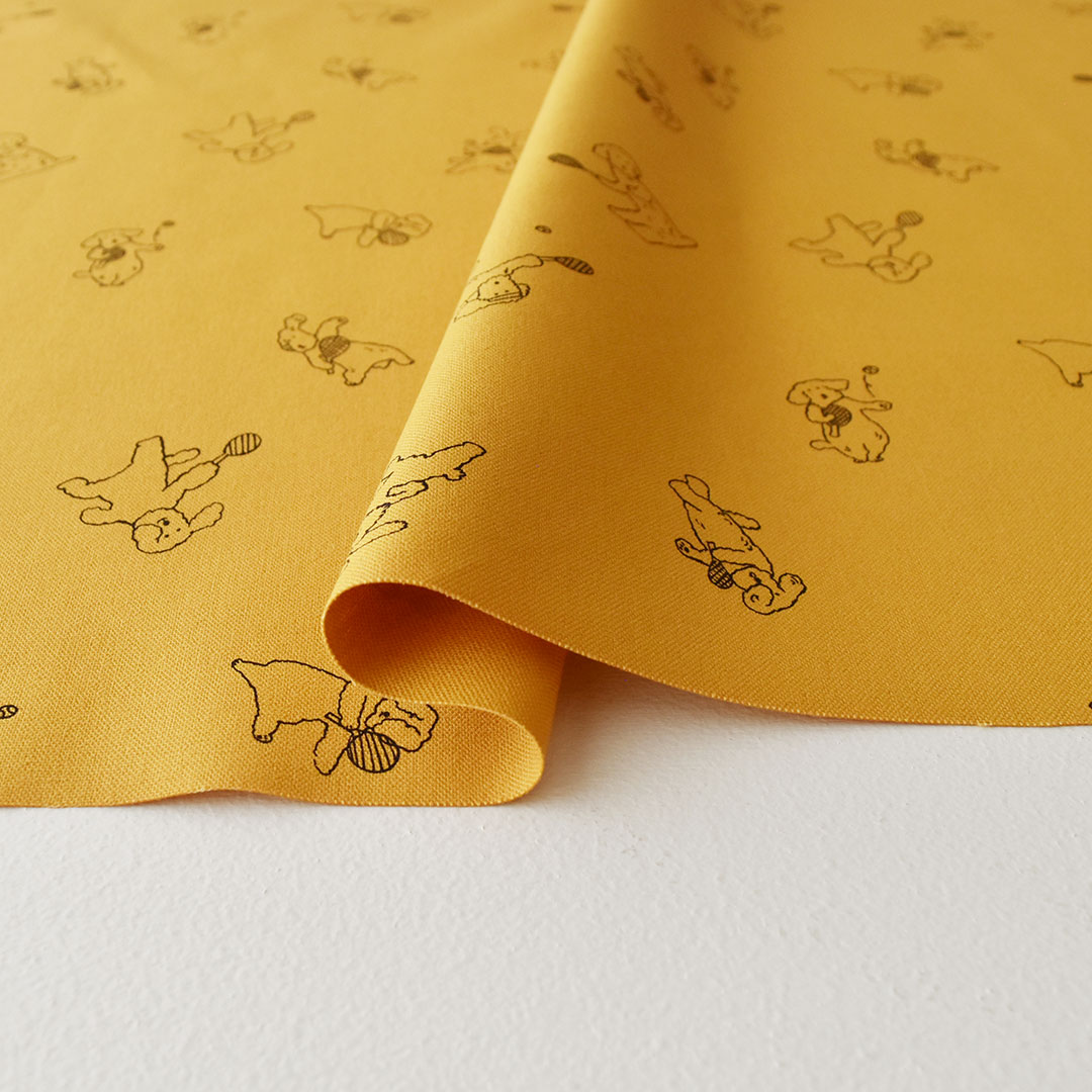 コットンキャンバスの布に、もこもこの犬のイラストをプリントしました。