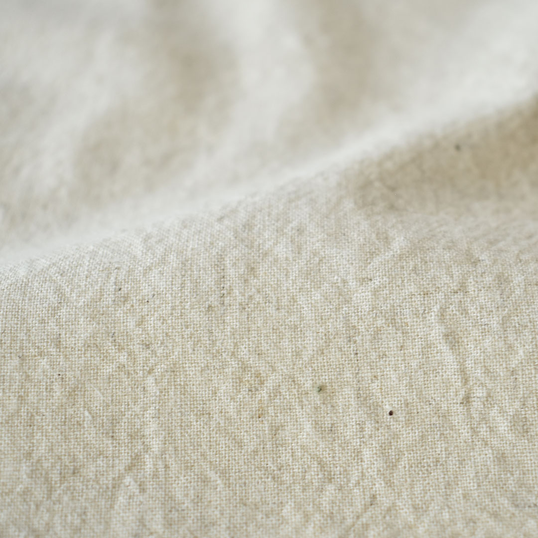 コットンとヨーロッパ産の上質なリネンを原料に、日本国内で紡績から織り上げまで丁寧に行い、生機も純国産のものを使用しています。リネンを高率で配合することで、やわらかな肌触りの中に、自然素材ならではのナチュラルな風合いと深みをプラスしました。