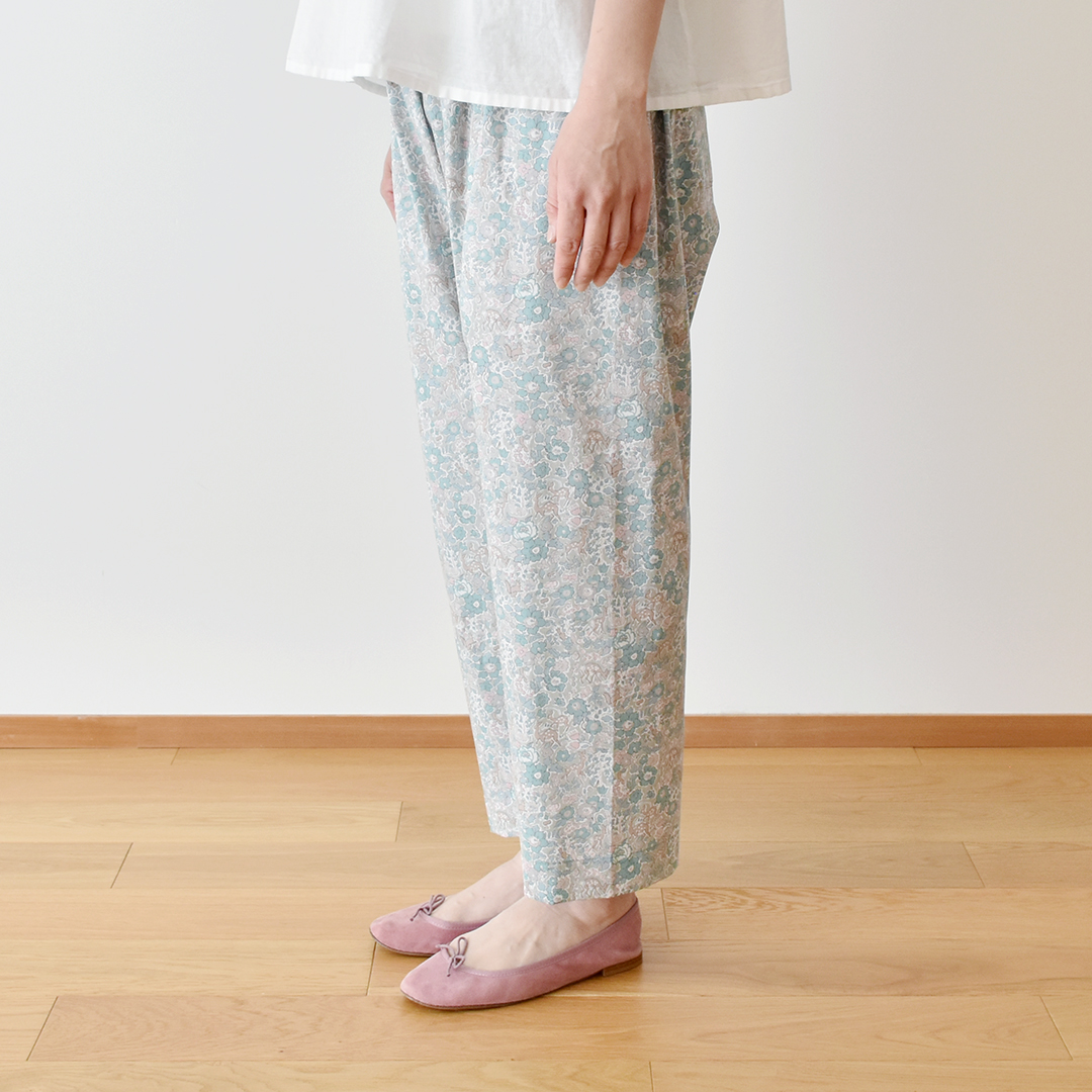 こちらの布をお買い上げのお客さまに、かんたんテーパードパンツのレシピをおつけいたします。(サンプル:◎J20A(グレージュ地にブルーグリーン・グレー系)) ※用尺:108cm幅×2.2m