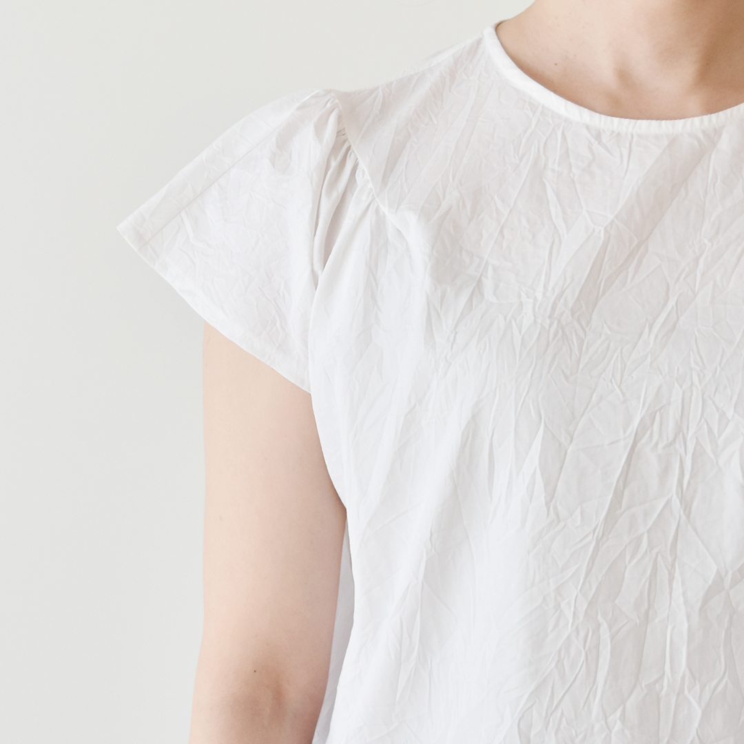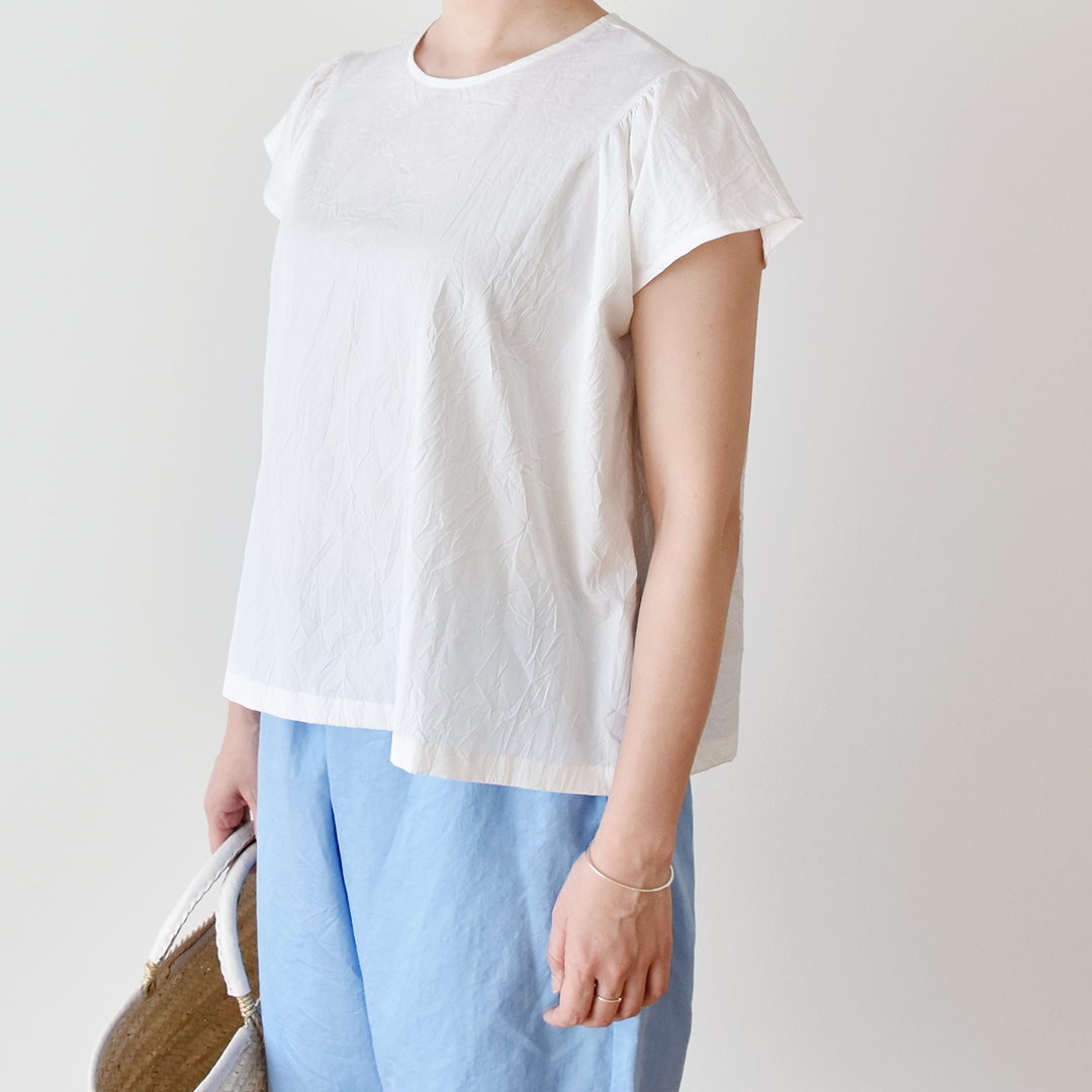 sunny days シリーズの布をお買い上げのお客さまに、ショルダーギャザーのフレンチスリーブブラウスのレシピをおつけいたします。(サンプル:ホワイト) ※用尺:110cm幅×1.6m