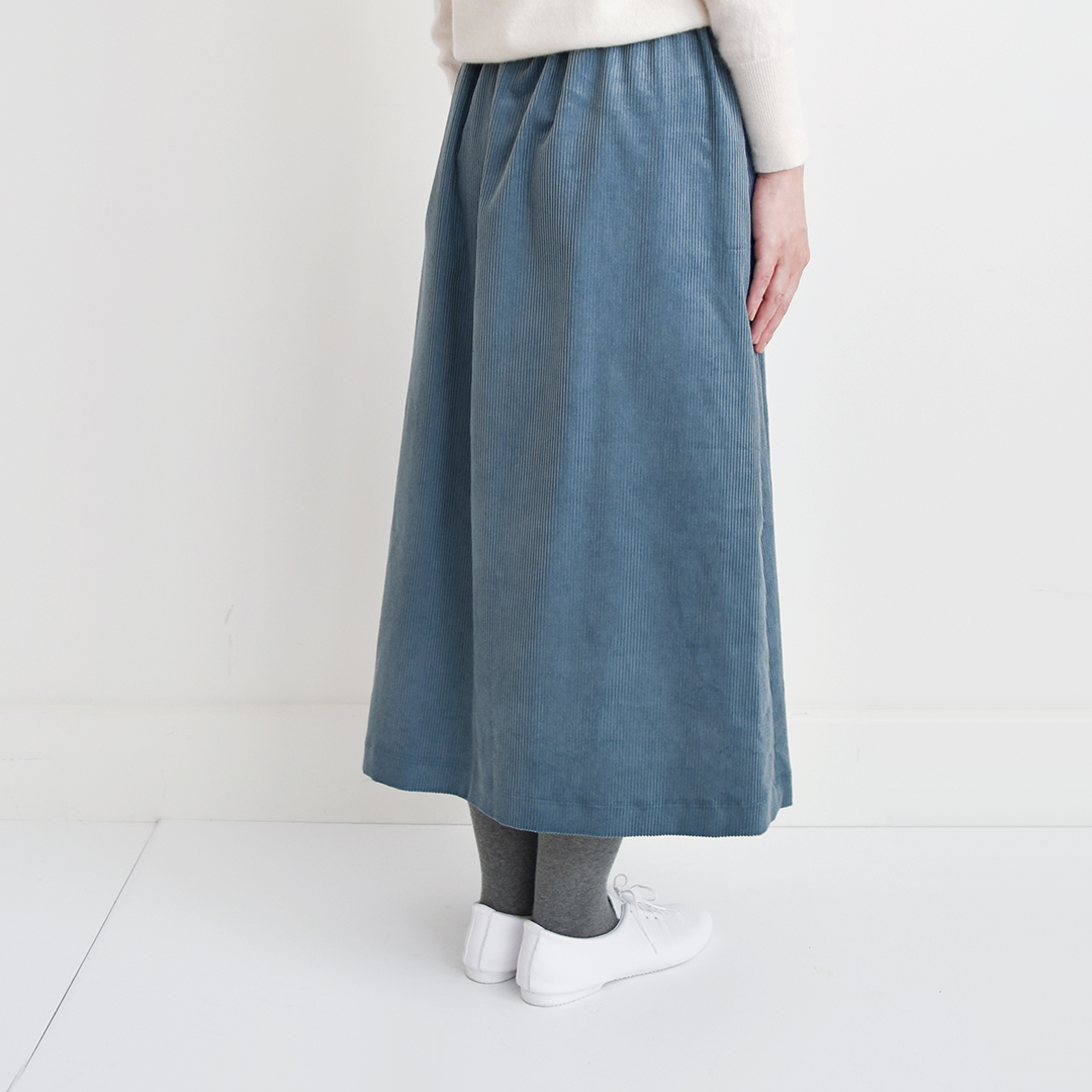 こちらの布をお買い上げのお客さまに、後ろゴムのタックスカートのレシピをおつけいたします。(サンプル:長い丈 ブルーグレー) ※用尺:短い丈103cm幅×1.4m/長い丈103cm幅×1.8m