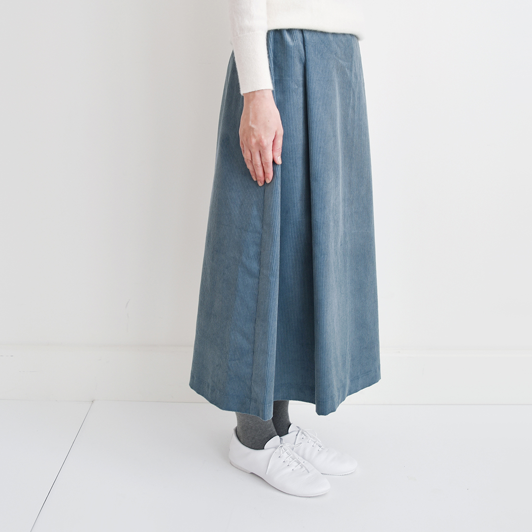 こちらの布をお買い上げのお客さまに、後ろゴムのタックスカートのレシピをおつけいたします。(サンプル:長い丈 ブルーグレー) ※用尺:短い丈103cm幅×1.4m/長い丈103cm幅×1.8m