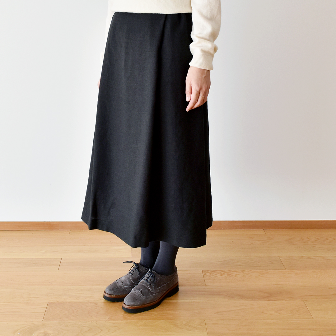 こちらの布をお買い上げのお客さまに、後ろゴムのタックスカートのレシピをおつけします。(サンプル:長い丈 ブラック) ※用尺:110cm×1.4m/1.8m(短い丈/長い丈の順)