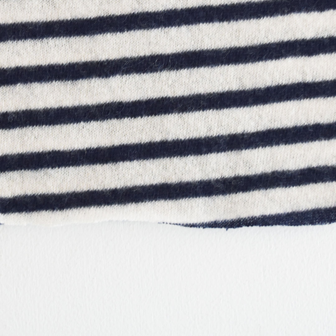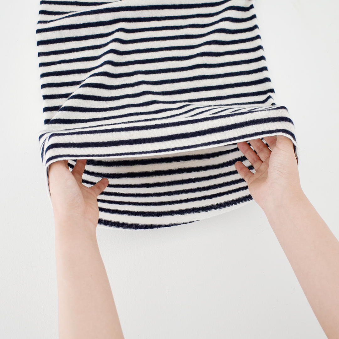 ・カットの際は、ふんわりと置いて測り、テンションを上げずにカットしておりますが、生地の性質上、湿度や温度により伸縮するため、タテヨコともにお届け時に多少前後する可能性がございます。ご了承ください。筒状に編まれているため、切り口はボーダーの柄が斜めになります。ご了承ください。