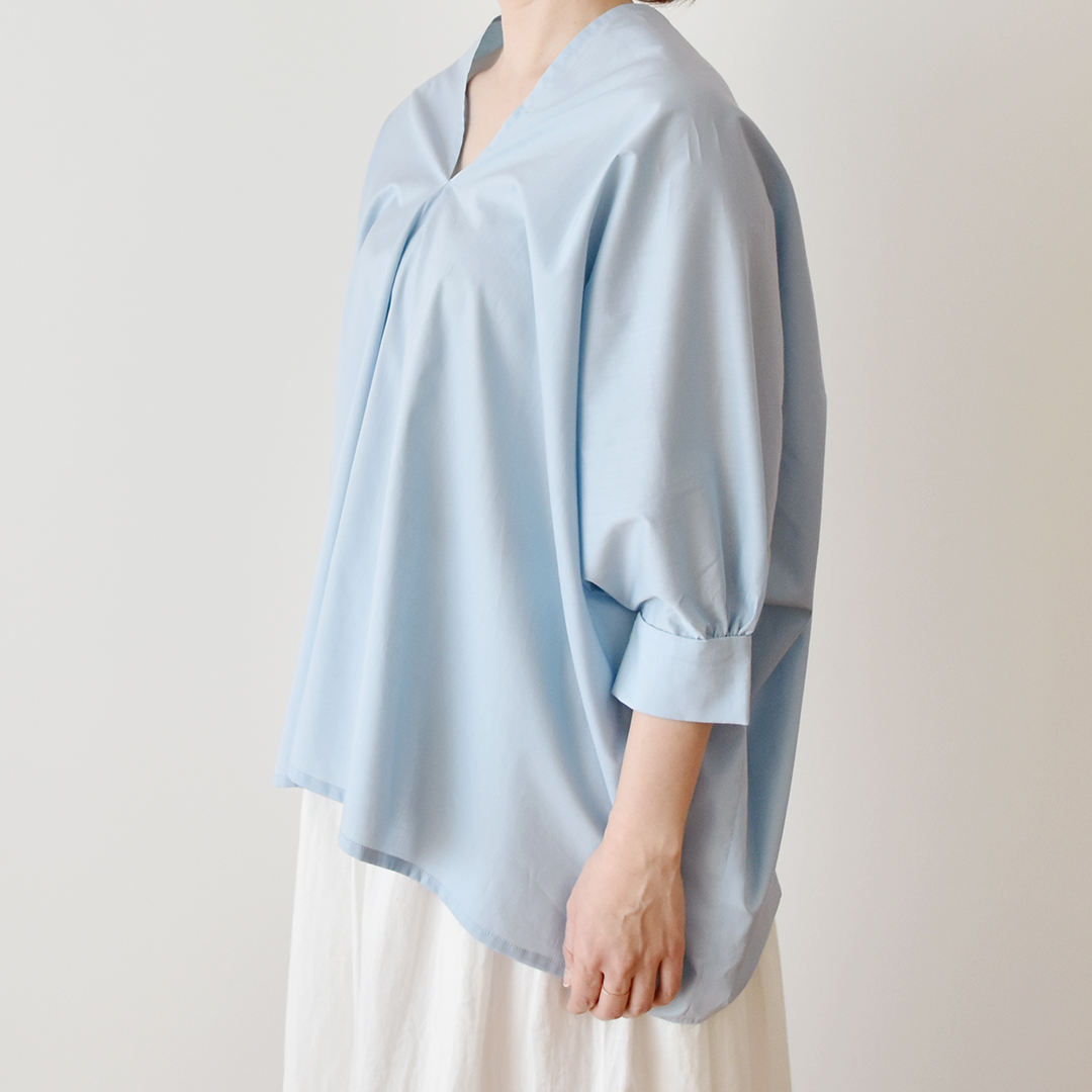 こちらの布をお買い上げのお客さまに、長方形でできるブラウスのレシピをお付けいたします。(サンプル:サックス) ※用尺105cm幅×1.6m