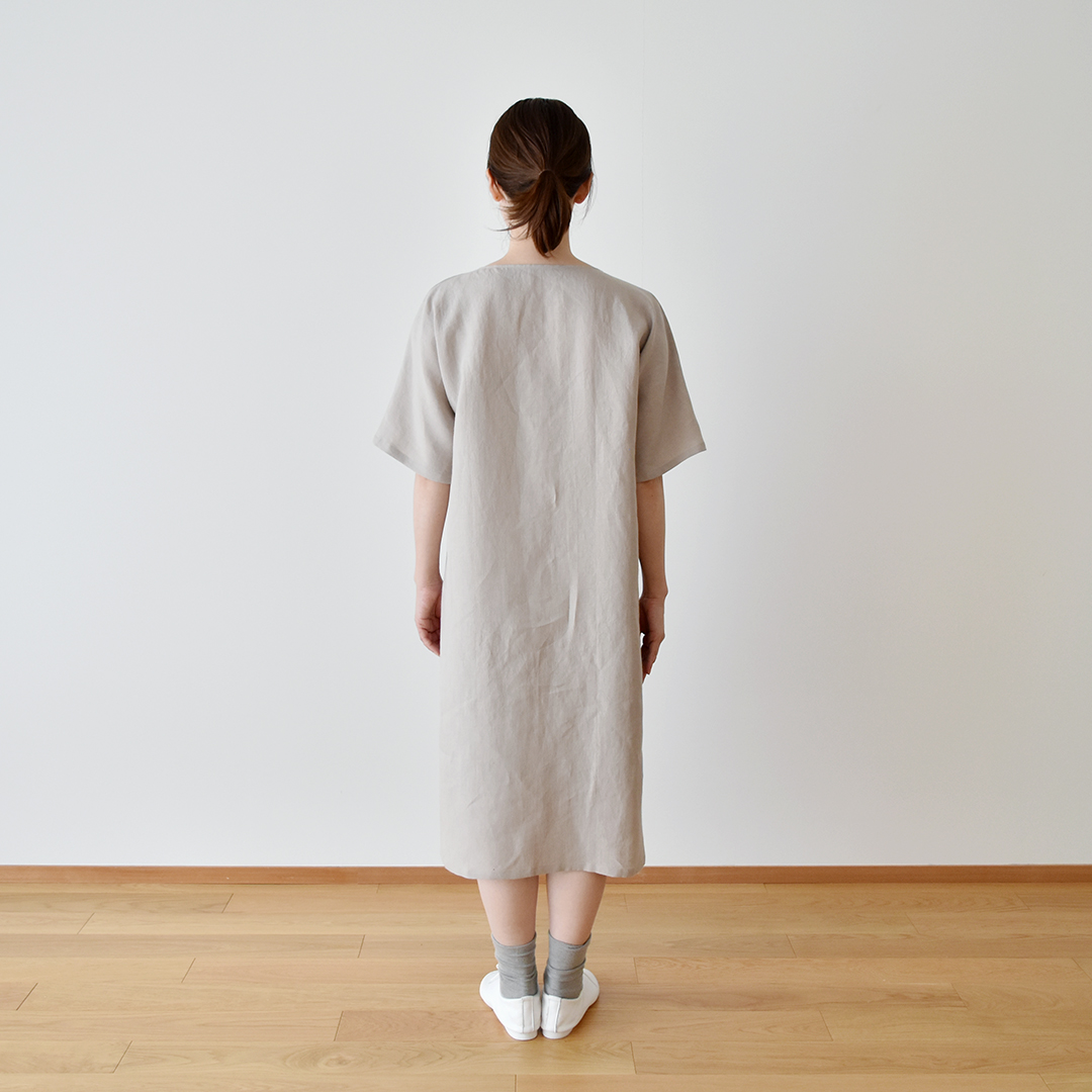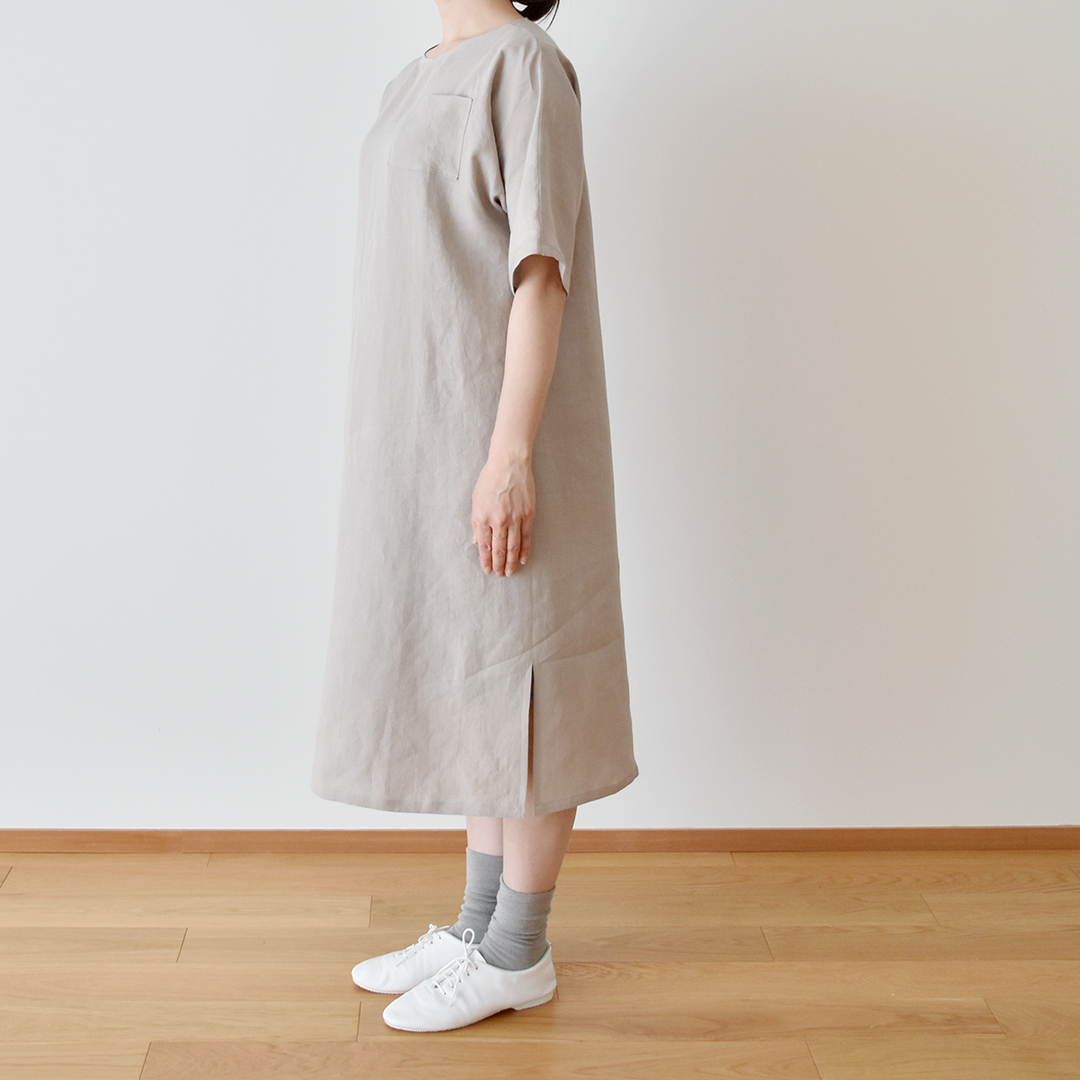 こちらの布をお買い上げのお客さまに、ラインでつなぐワンピース(スリット入りロング丈) のレシピをお付けいたします。(サンプル:グレージュ) ※用尺110cm幅×2.4m