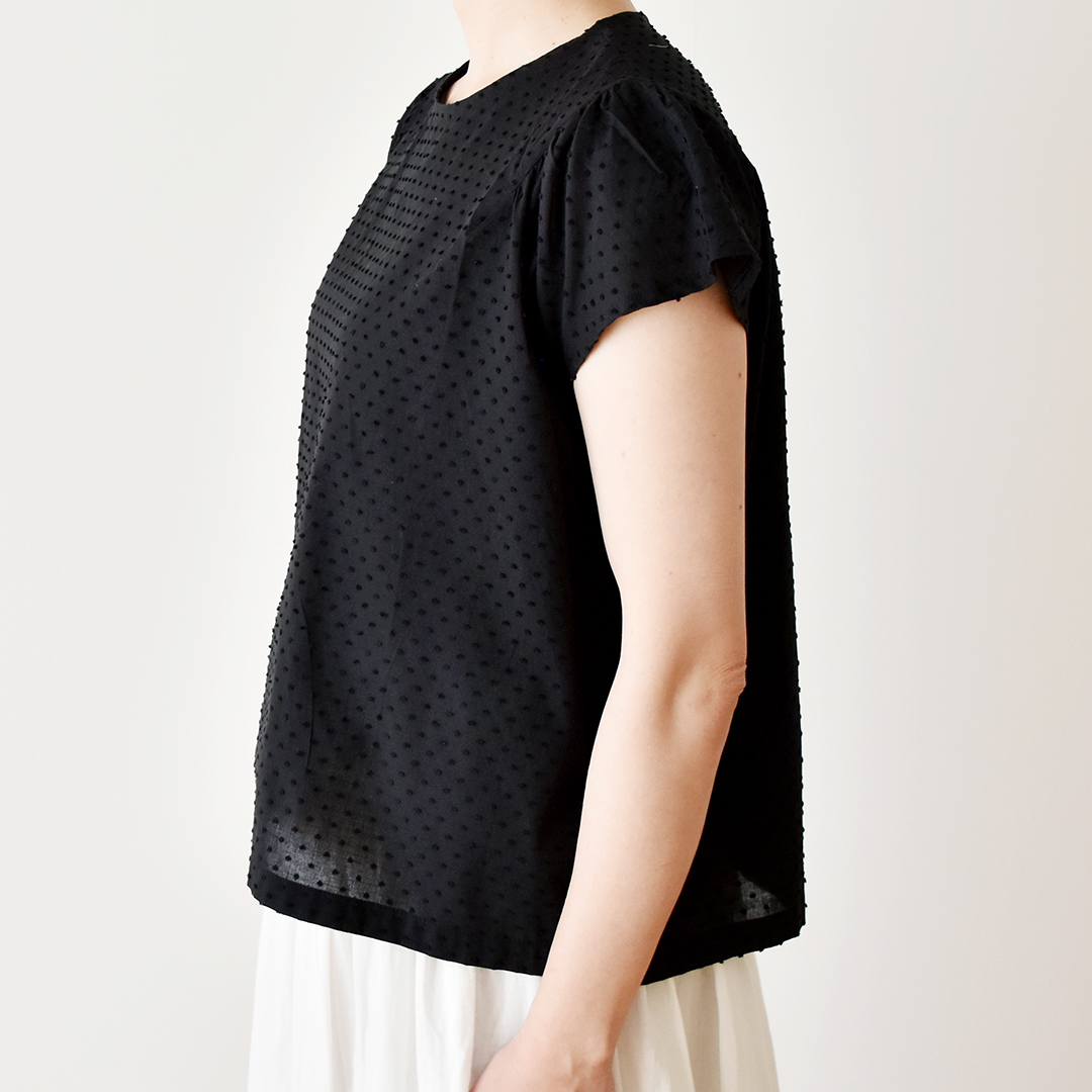 こちらの布をお買い上げのお客さまに、ショルダーギャザーのフレンチスリーブブラウスのレシピをおつけいたします。(サンプル:黒に黒) ※用尺:105cm幅×1.6m