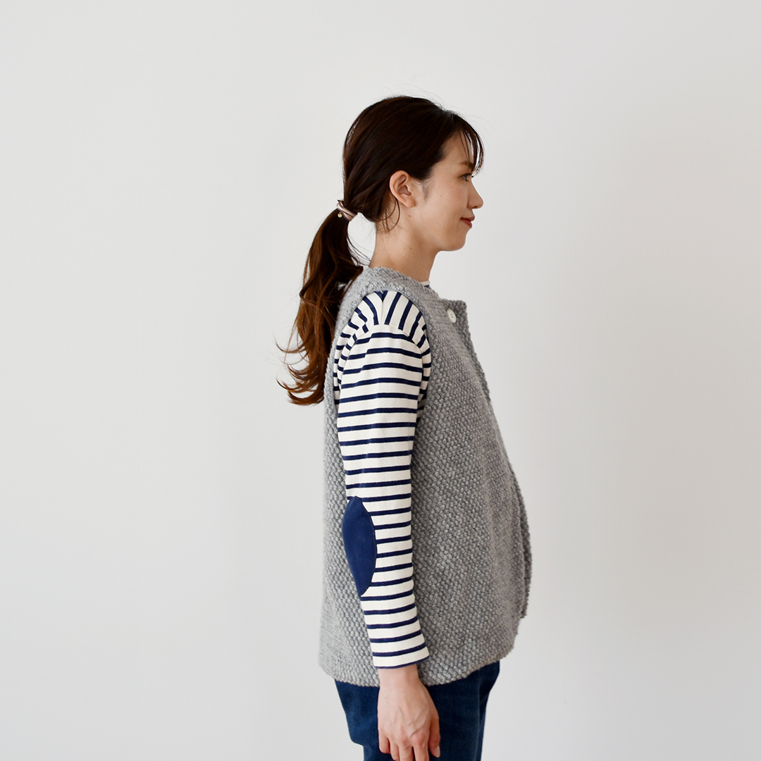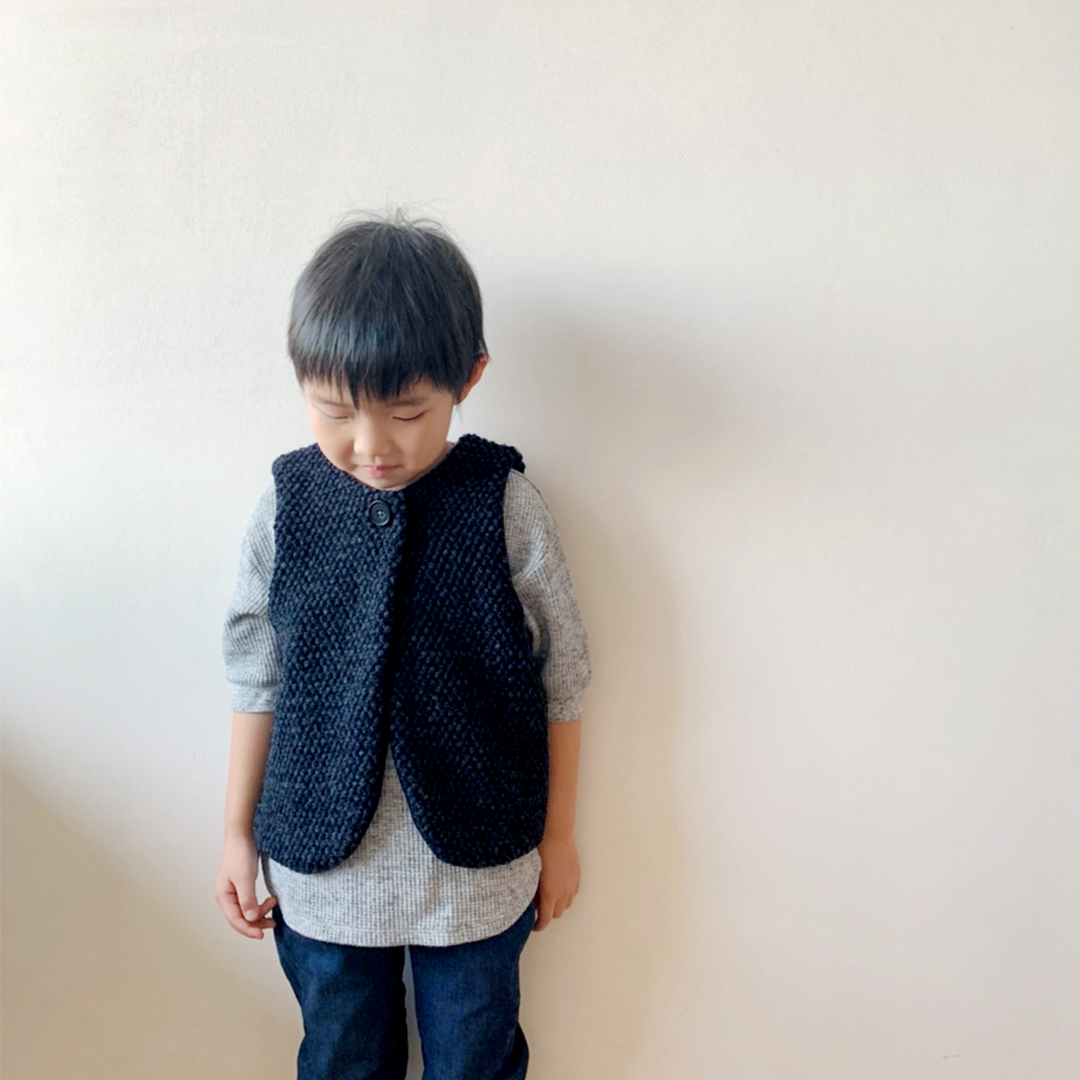 こちらの布をお買い上げのお客さまに、C&Sぽこぽこウールニットのまえあきベストのレシピをお付けいたします。子ども小90~100cm、子ども大110~120cm、大人の3サイズでお作りいただけます。(サンプル:オフホワイト、メランジュネイビー、グレー) ※用尺:幅なり×0.5/0.5/0.7m(子ども小/子ども大/大人の順)