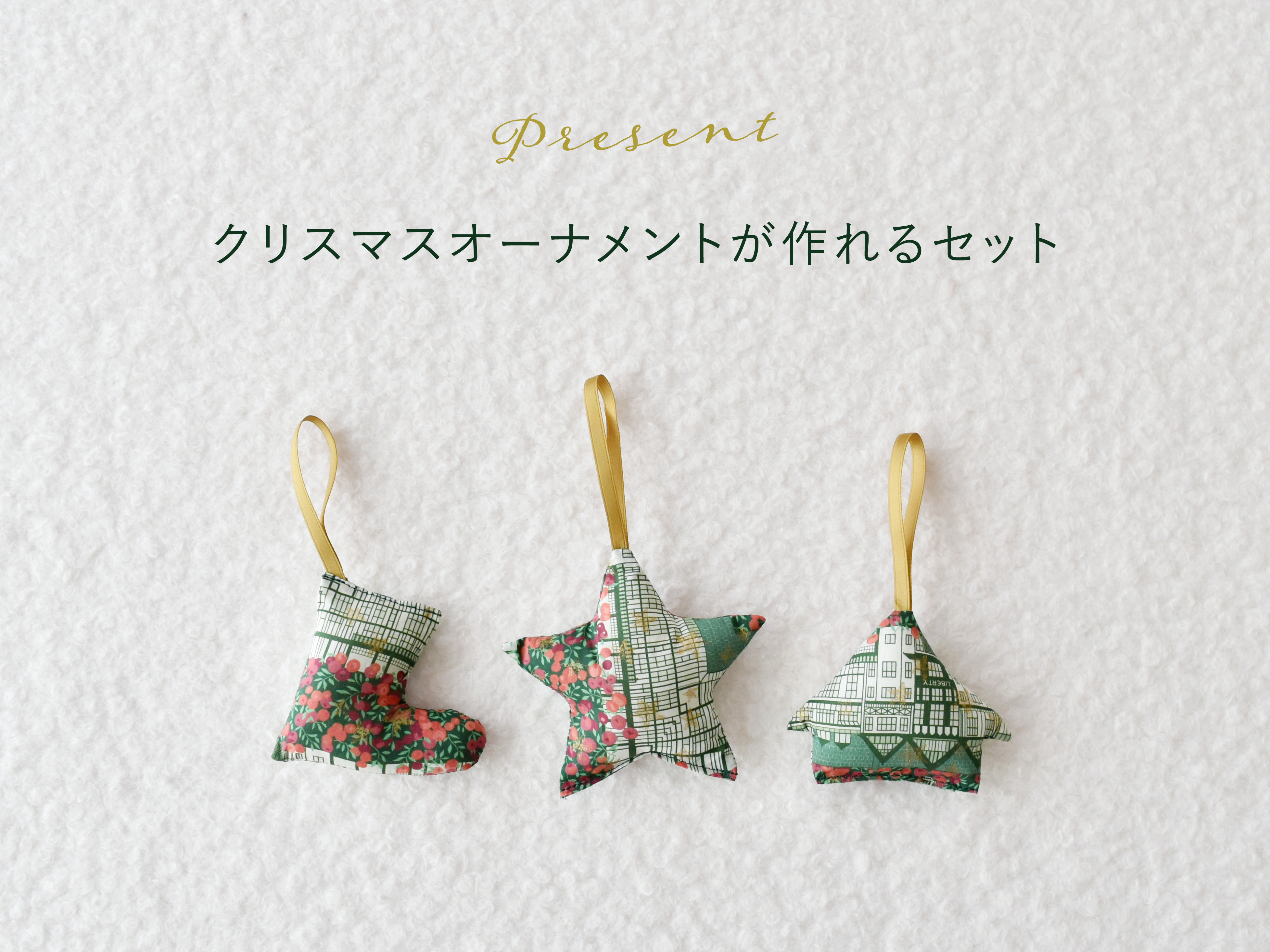 リバティプリントのクリスマス柄でつくるオーナメント。ぜひクリスマスの飾りにお作りください。