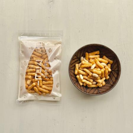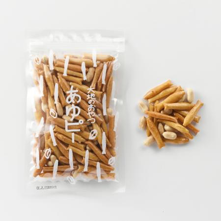 国産もち米100%の生地をていねいに焼き上げ、丸大豆たまり醤油と粗糖のみで味付けしたあゆの形のあられと、厳選した風味豊かな有機ピーナッツの、たのしい、おいしい、組み合わせです。 -