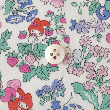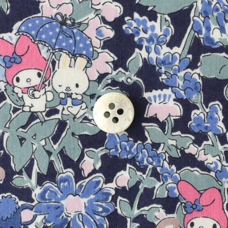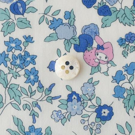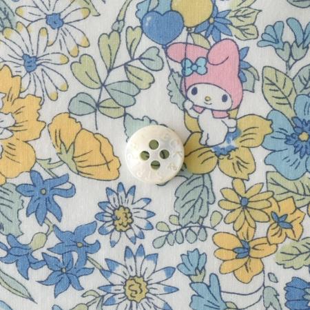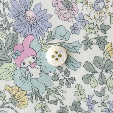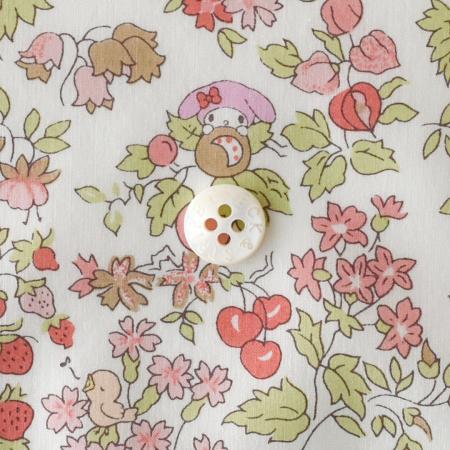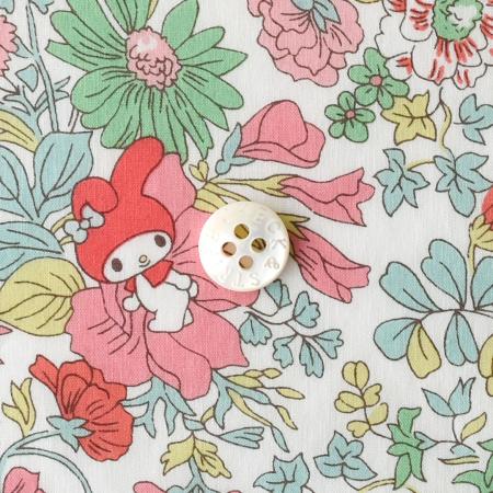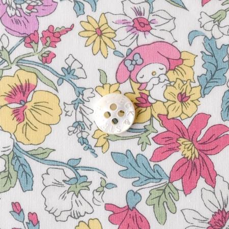 1993年にリバティのスタジオで再描画された「エミリー」は、1940年代のアーカイブプリントから着想を得ています。ヒナギクやマーガレットなどバラエティーに富んだ花を繊細な輪郭でラフに描かれ色付けされた中サイズの花柄です。茶目っ気あるマイメロディたちがお花や葉っぱの間でかくれんぼをしています。ⓒ 2025 SANRIO CO., LTD. APPROVAL NO. L656909 -