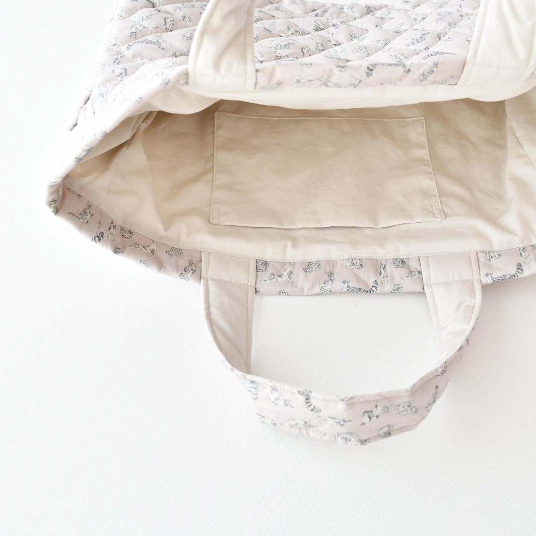 こちらの布をお買い上げのお客さまに、キルティングで作るサイドポケットのトートバッグのレシピをお付けします。オンラインでは初めてご紹介するレシピです。(サンプル:Meow-petit ◎J24F(マッシュルーム)) ※用尺:100cm幅× 70cm