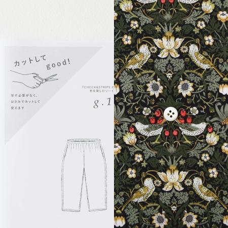 カットしてgood!パターン「シンプルテーパードパンツ」とリバティプリント「Strawberry Thief NE(ブラック地にグリーン・レッド系)」の着分セット