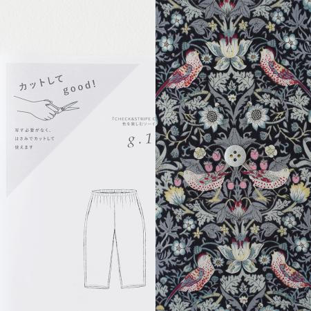 カットしてgood!パターン「シンプルテーパードパンツ」とリバティプリント「Strawberry Thief LE(スミクロ系)」の着分セット