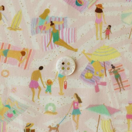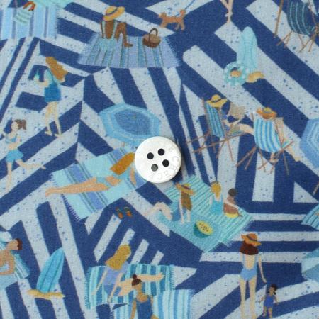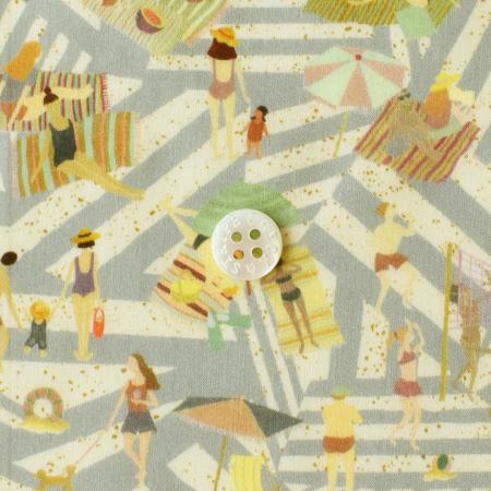 リバティのスタジオで手描きされた、遊び心あふれるカンバセーショナル・パターン「ショアライン」。細部まで描き込まれた数々のモチーフが、見る人を物語の中へと誘います。グレイソン・ペリーのセラミック作品に見られる社会的な物語性や、ミクストメディアを自在に取り入れる表現手法から着想を得て、英国の海辺で過ごす夏の、のびやかで気ままな空気感を描き出しています。浜辺では、砂浜でくつろいだり、遊びに興じたり、本を読む人々の姿が点在し、背景に配された大胆なストライプが、現代的なエッジを加えています。幾何学的なコラージュ効果が、全体にさりげない奥行きをもたらしています。