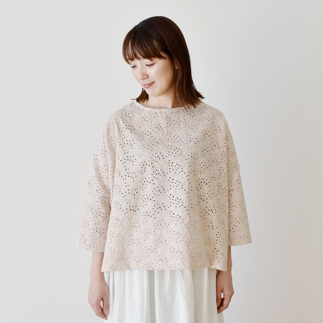 こちらの布をお買い上げのお客さまに、Dラインプルオーバー/ワンピースのレシピをお付けいたします。衿ぐりが詰まっていて、肩線が斜め(Diagonally)で肩に沿うデザインです。 (サンプル プルオーバー:グレイッシュピンクにアイボリー) ※用尺(プルオーバー/ワンピース):103cm幅×2m/2.9m