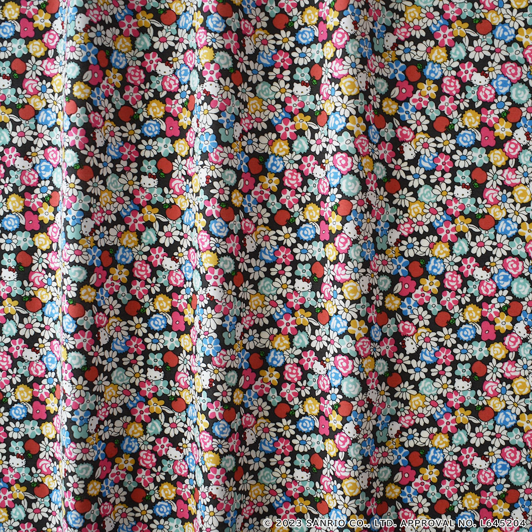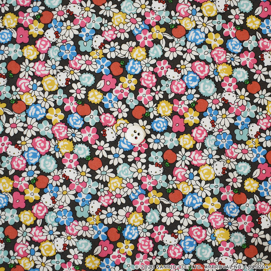 元々のデザインは、イギリスの果樹園を謳歌する多方向のデザインで、1970年代後半にリバティのために手描きされプリントされていました。鮮やかなリンゴ、ヒナギク、バラの花々の中からハローキティがそっと覗かせ、間違いなくリンゴ狩りのシーズン真っ盛りです! -