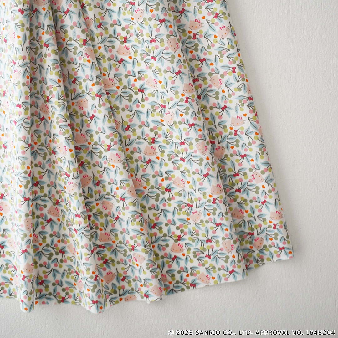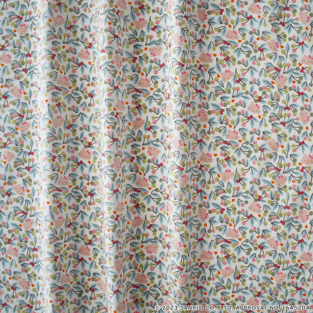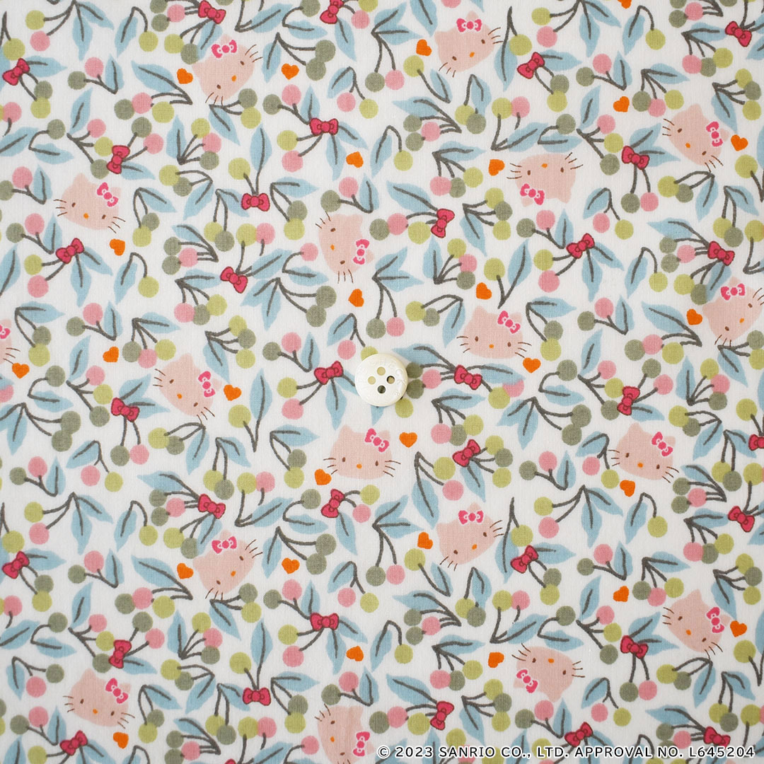 葉が茂った桜の枝が楽しげにはじけるような色彩を放つフルーティなボタニカル・デザインは、1969年のリバティのスカーフのボーダーに描かれていたデザインに由来しています。よく見ると、愛らしいハローキティの顔や小さなハート、可憐なヘアリボンが散りばめられています。 -