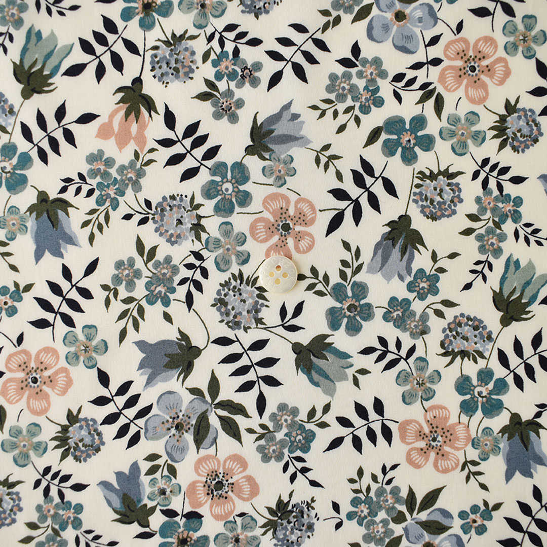 1994年にリバティ社が購入したデザインで、1997年からクラシックコレクションに加入しました。スペースのある構図と明るく軽快なこの柄は、アイボリー系の淡色グランドの配色のみならず、ネイビーなどの濃色のグランドの配色まで数多くの配色のヴァリエーションがあり、デザイン発表以来、リバティプリントを代表する1柄として、不動の人気を保っています。