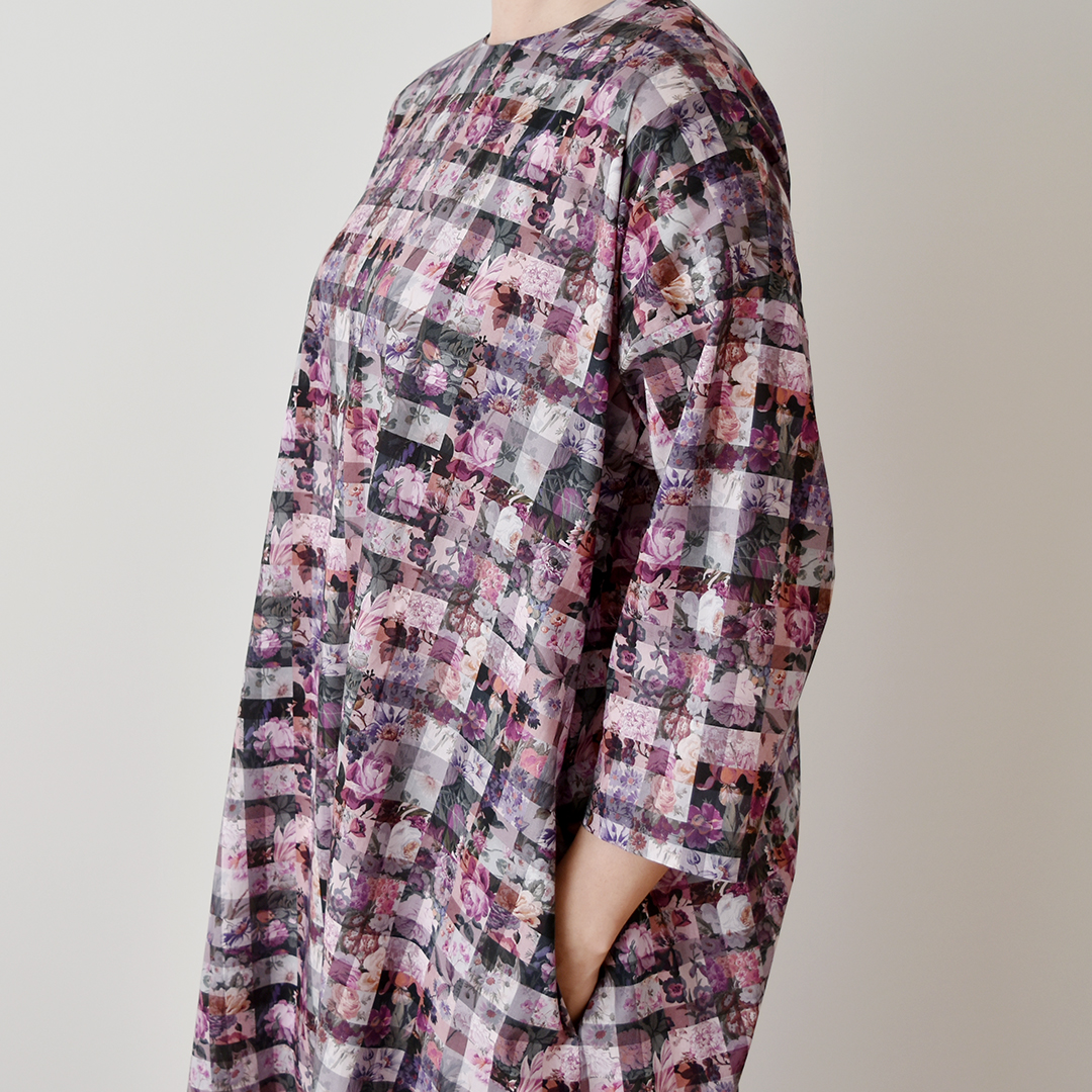 リバティのアーカイブに所蔵されているいくつかの手描き作品を繋ぎ合わせて作られたパッチワークの花柄は、チェック柄になるように慎重に構成されました。キク、バラ、チューリップ、デイジー、シャクヤク、クレマチスの花が格子から覗き、光と影の部分が独特の空間観を生み出しています。 -