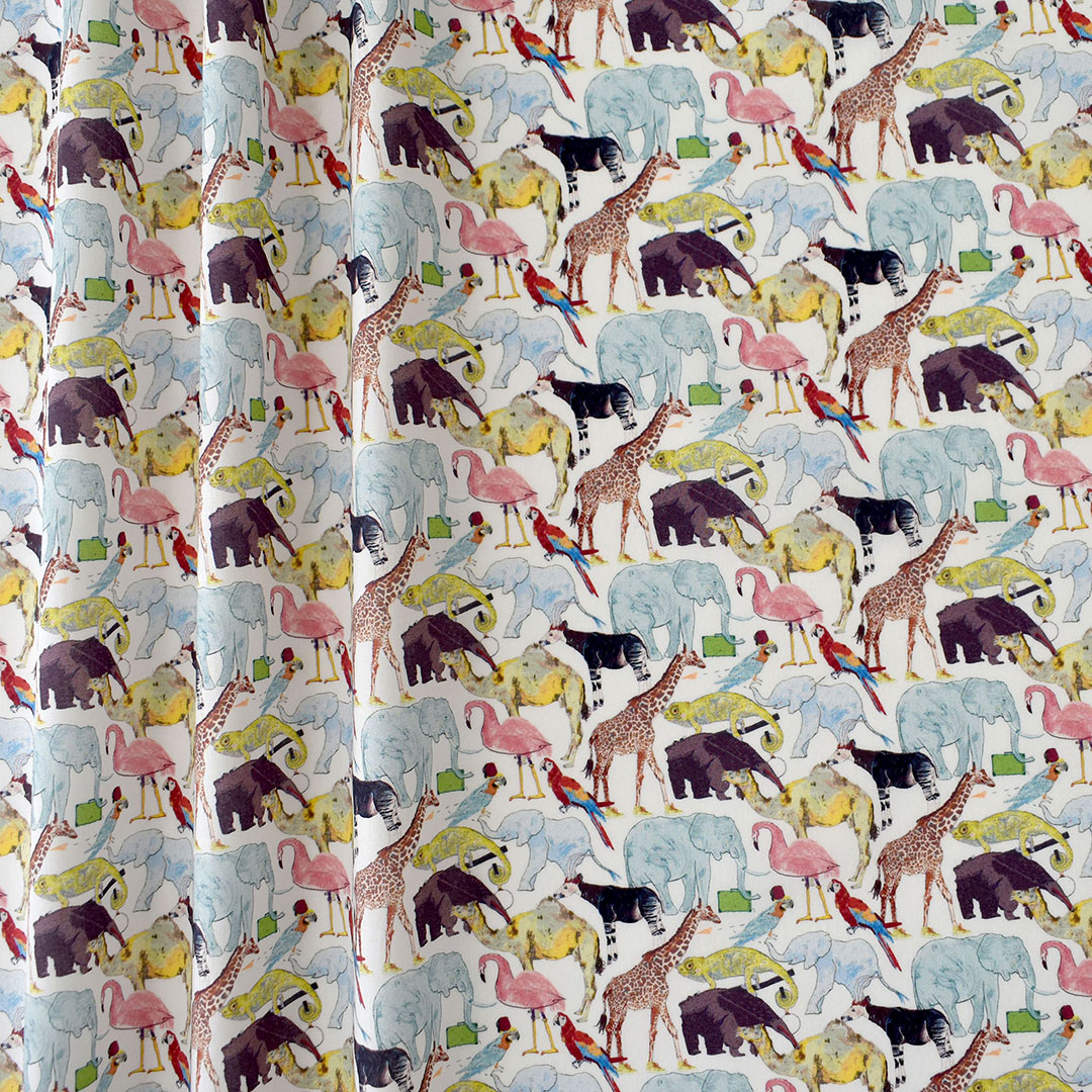 子供服売場を表すこの柄は、動物園の前で行列する動物たちをOK デービッドが描いたものです。デービッドは14歳の頃から絵や物語を描くことに専念しています。彼の物語には動物や子ども、そして差し迫る悪が登場します。彼は、芸術や全てのものは単純で偽りのないことが最高であるという信念をもっています。この「動物園の行列」に登場する動物は全てリバティ・ファブリックスのコレクションのためにだけに手描きされ、色づけされました。