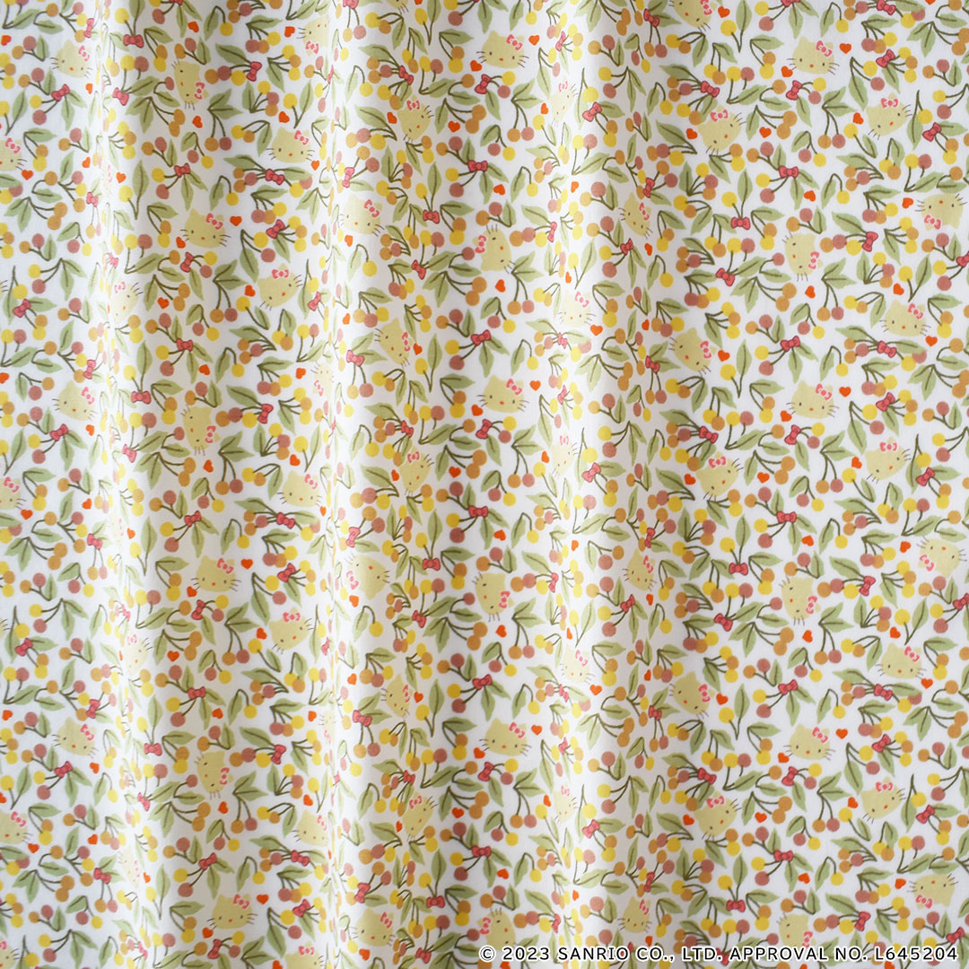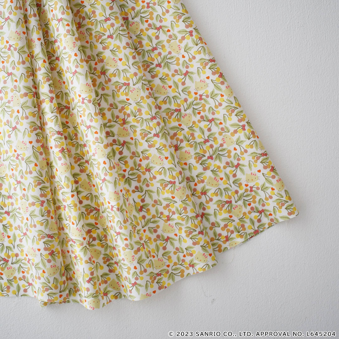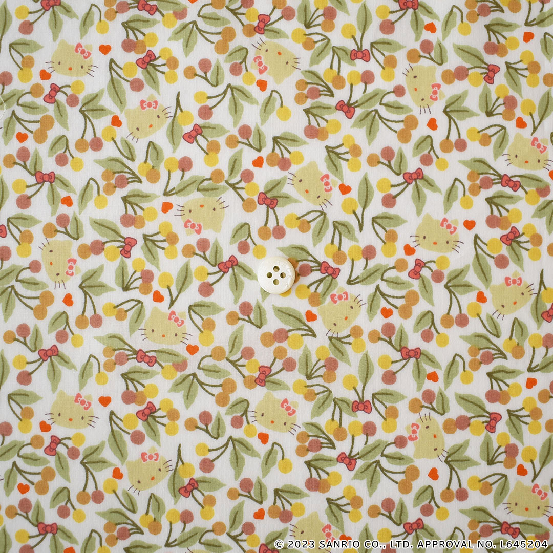 葉が茂った桜の枝が楽しげにはじけるような色彩を放つフルーティなボタニカル・デザインは、1969年のリバティのスカーフのボーダーに描かれていたデザインに由来しています。よく見ると、愛らしいハローキティの顔や小さなハート、可憐なヘアリボンが散りばめられています。
