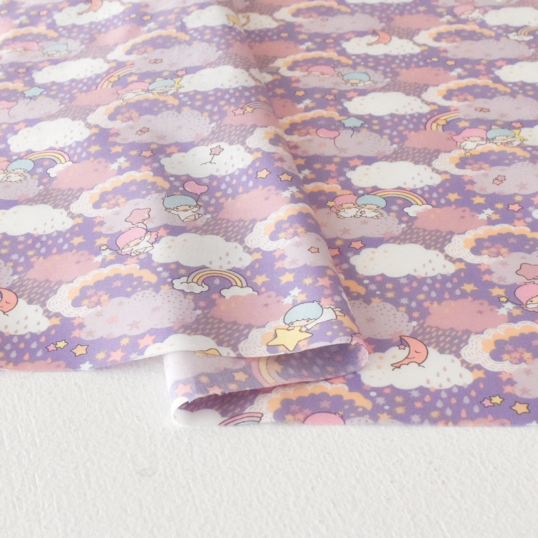 星空と枕のように柔らかな雲が夢の国の様です。きらめく星と輝く雨摘が子供時代の思い出を連想させるこの魅力的なプリントは、ロバート・ルイス・スティーヴンソンによる「子供の詩の園」の詩をベースに2015年に作られました。今回のコラボレーションのために、この魔法のようなリバティの世界にリトルツインスターズが加わり、さらに楽しそうなプリントになりました。ⓒ 2025 SANRIO CO., LTD. APPROVAL NO. L656909 -