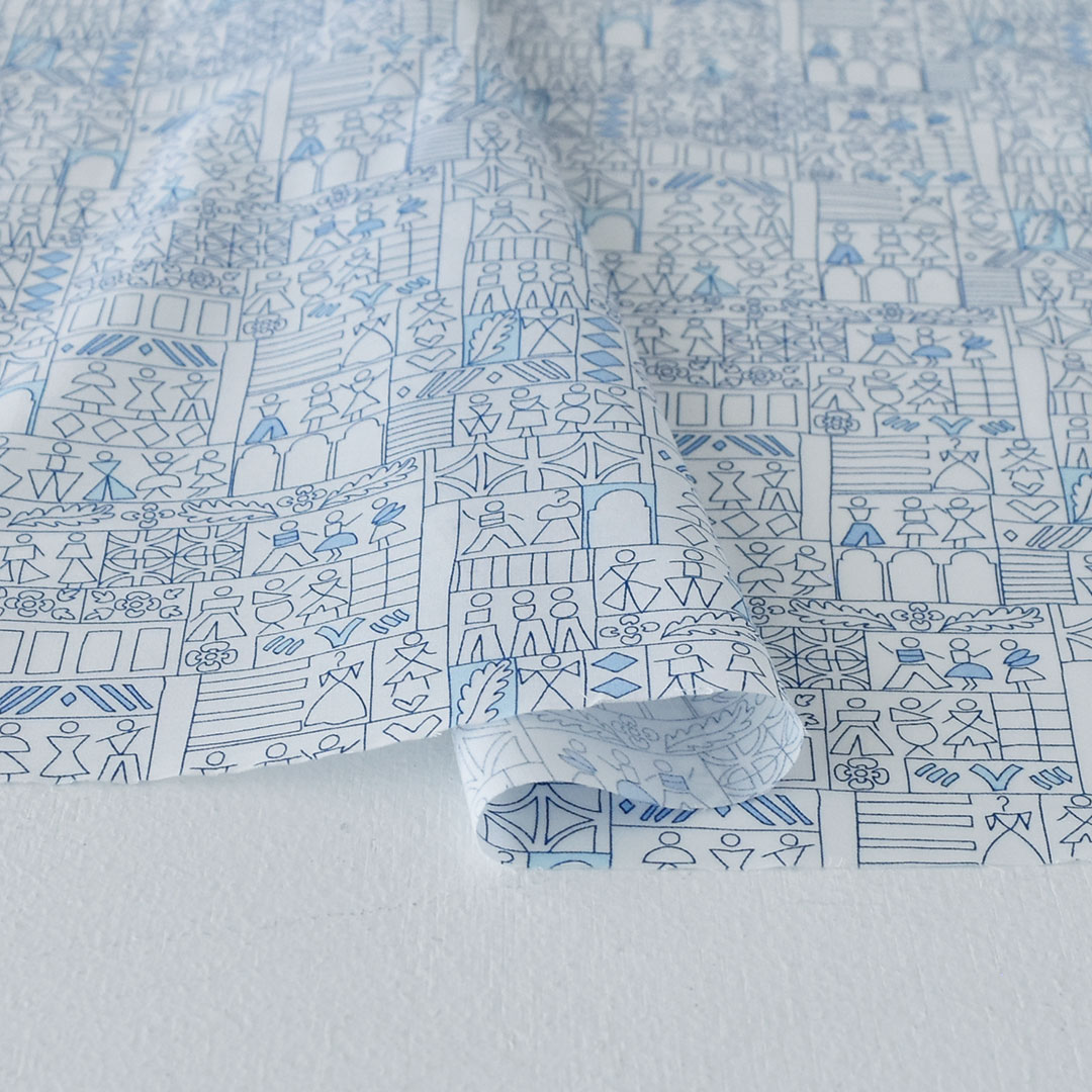 リバティ・ストアの一日を切り取った幾何学的なカンバセーショナル・デザインです。独特の木材の梁、彫刻が施されたパネル、ガラス窓が描かれ、買い物客が最新のファッションに目を輝かせる様子が描かれています。
