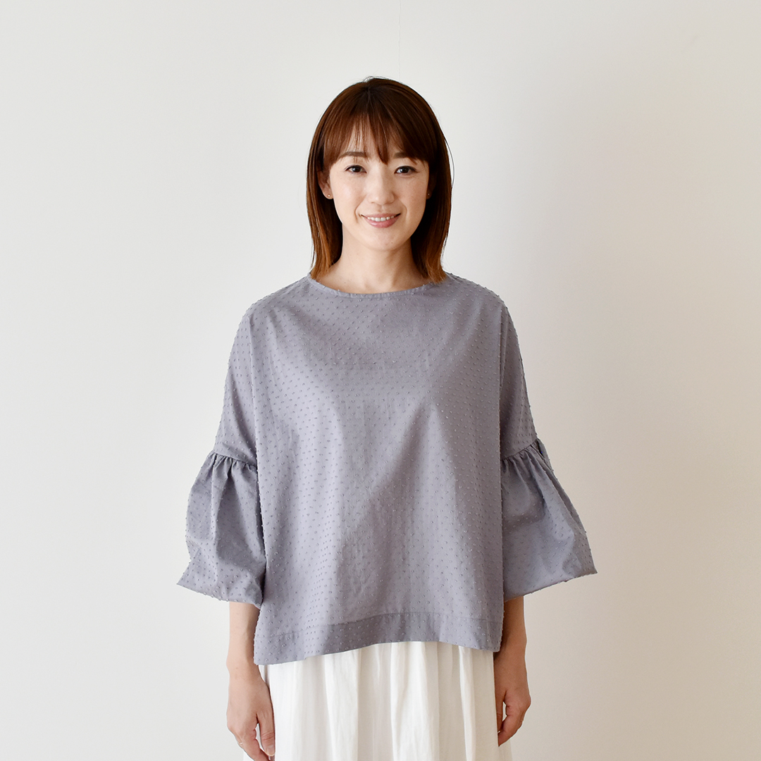 こちらの布をお買い上げのお客さまに、バルーンスリーブブラウスのレシピをおつけいたします。(サンプル:白に黒、ラベンデューラ) ※用尺105cm幅×2.5m