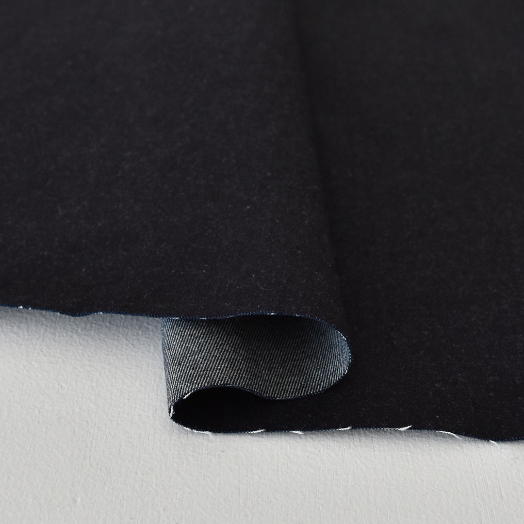 高密度に織られた幅広デニムです。10.5ozくらいの厚みがあります。ポリウレタンが少し入っていてストレッチが効いております。パンツやスカート、薄手のコートなどに。