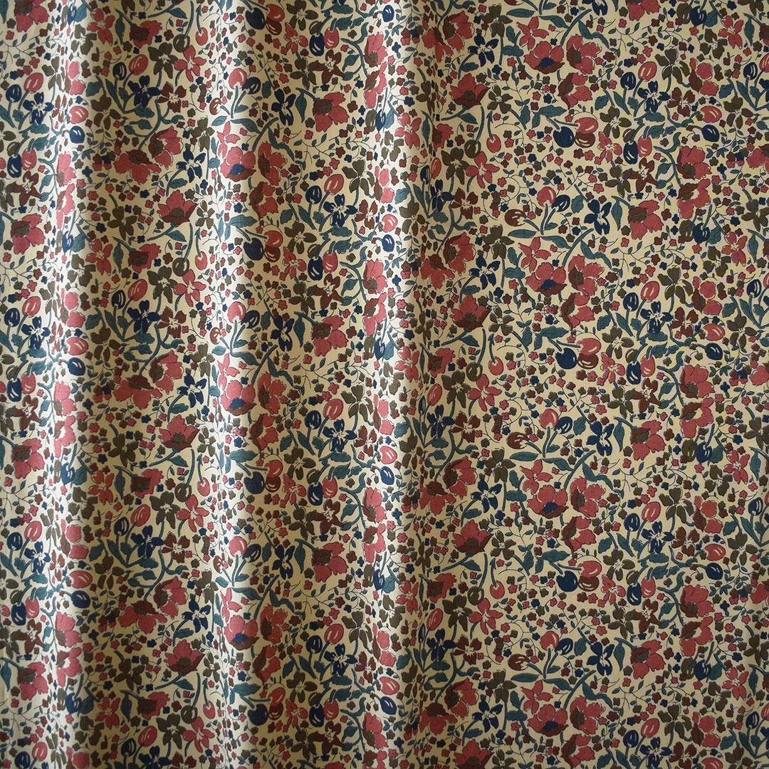 アネモネ、ワスレナグサ、ベリー、そして小さなデイジーがミックスされたリバティの典型的なパターンです。