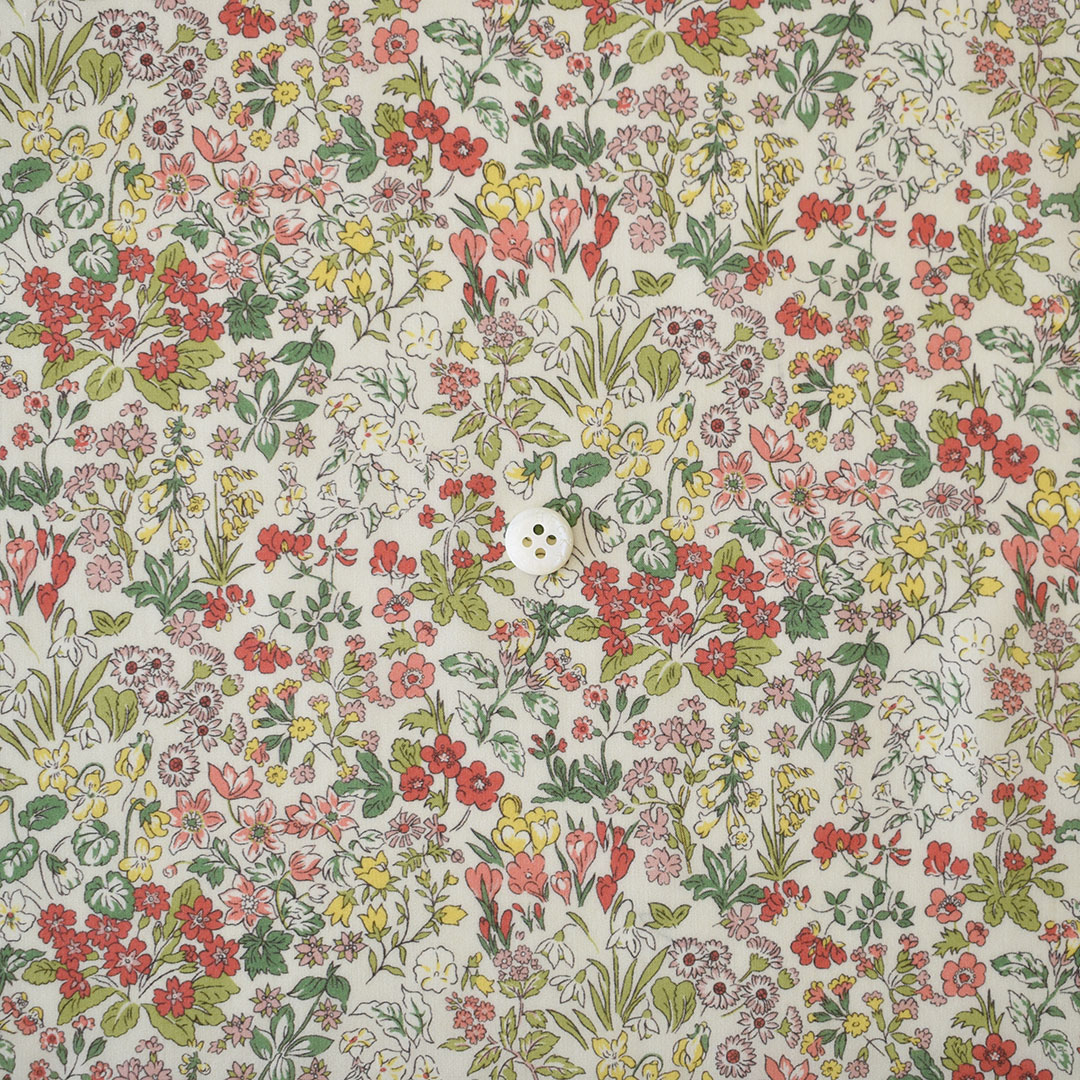 オリジナルは、1940年代に制作されリバティのマートン・プリント工場でプリントされたデザインで、春の草原のエッセンスを魅力的に表現しています。デイジー、パンジー、スノードロップ、クロッカス、キンポウゲが、リバティの真骨頂である繊細なアウトラインで描かれたボタニカルスタイルの緻密なパターンを作り出しています。