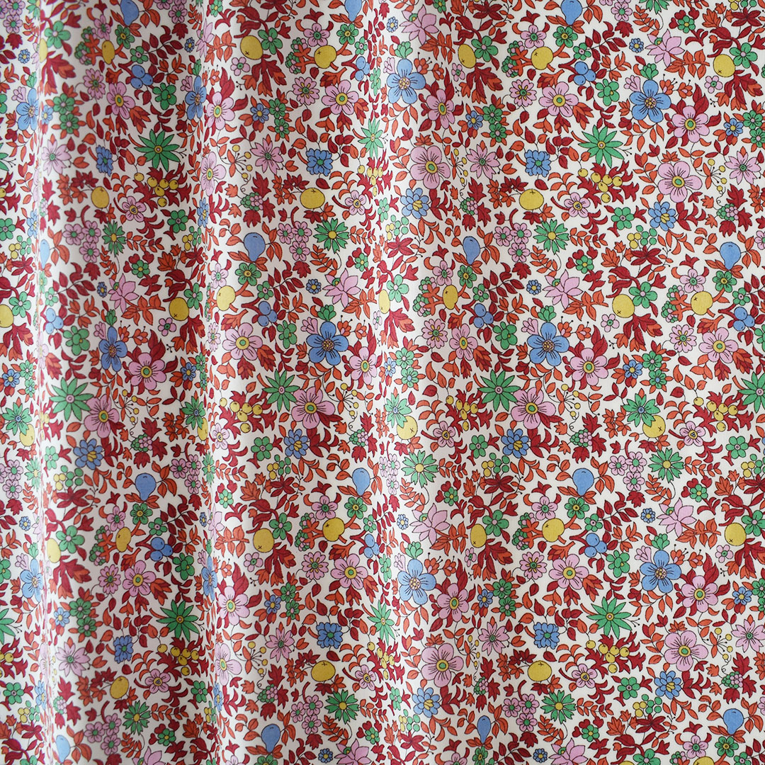 1964年にリバティのマートン工場で制作・印刷されたこの甘く愛らしいデザインには、ジューシーな夏のフルーツがたくさん描かれています。花、葉、ベリー、ブドウ、オレンジ、洋ナシなどのカラフルなボタニカルデザインは、1960年代の典型的なグラフィックプリントを彷彿とさせ、繊細でポップな美学が感じられます。