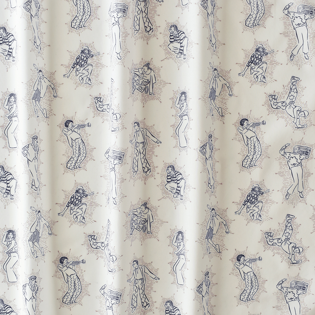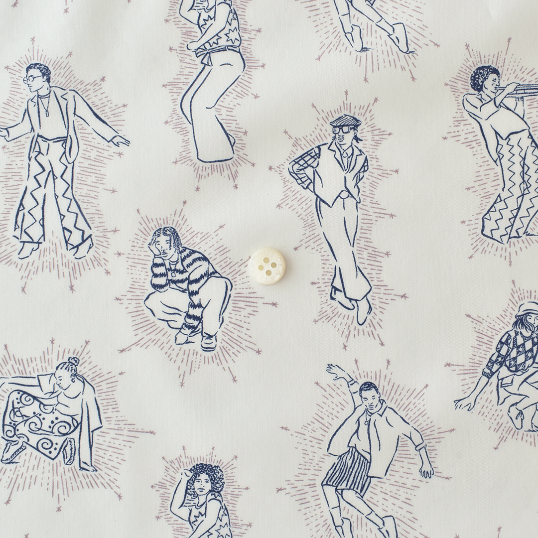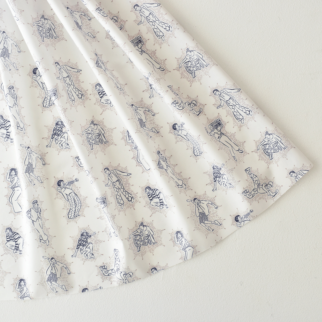 ファッションと音楽の深い結びつきからインスパイアされたダイナミックで表現力豊かなこのプリントは、ヒップホップとジャズの活気に満ちたサブカルチャーから影響を受けています。リバティデザインスタジオで手描きされたこのユニークでカンバセーショナルなプリントは、音楽のビートに合わせて流れるように動く想像上のダンサーたちを表現しています。
