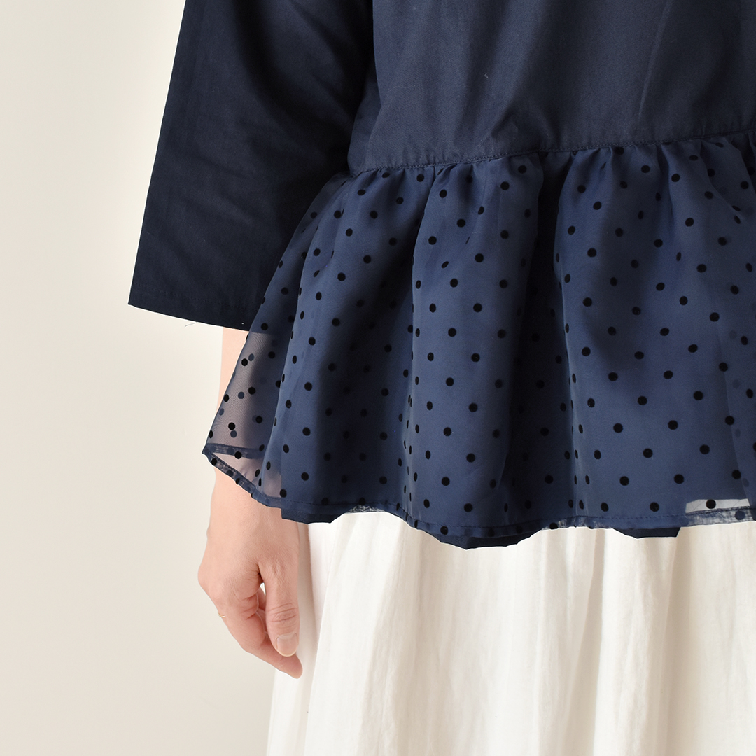 こちらの布をお買い上げのお客さまに、デイリープルオーバー(ギャザーブラウス・オーガンジーアレンジ)のレシピをおつけいたします。初めてご紹介するレシピです。(サンプル:ネイビー地にブラック)※用尺 110cm幅×0.5m