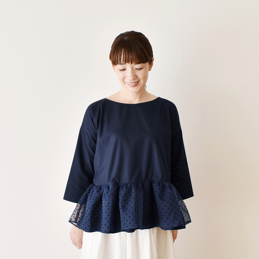 こちらの布をお買い上げのお客さまに、デイリープルオーバー(ギャザーブラウス・オーガンジーアレンジ)のレシピをおつけいたします。初めてご紹介するレシピです。(サンプル:ネイビー地にブラック)※用尺 110cm幅×0.5m