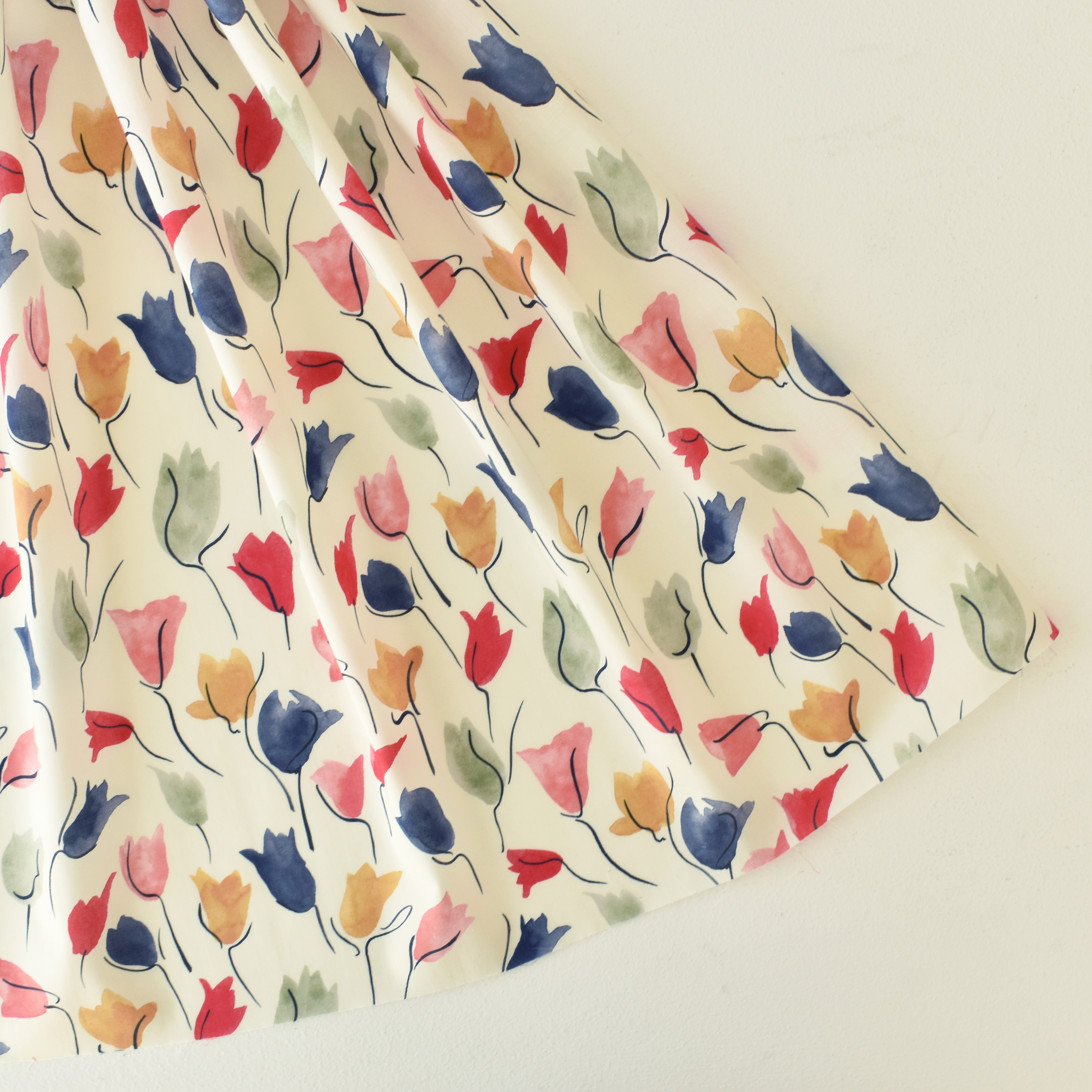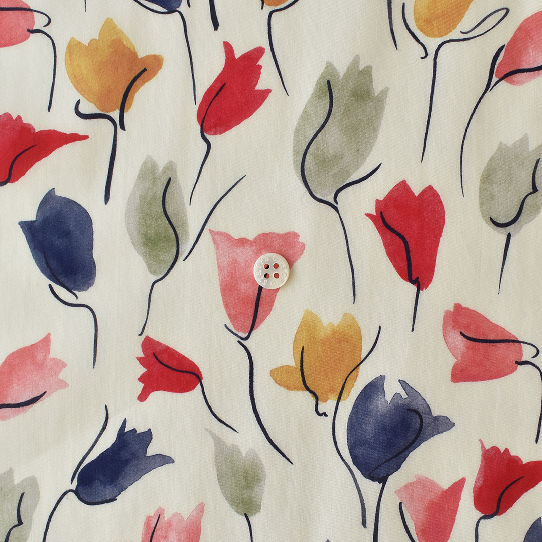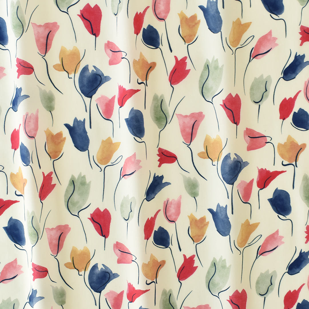 ミドルスケールの抽象的な花のデザイン「チューリップ・シャドー」は、アーカイブ作品から着想を得てスタジオにて水彩絵の具でペイントしなおされました。