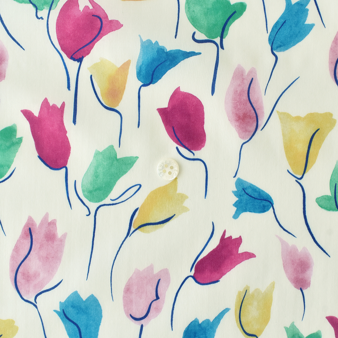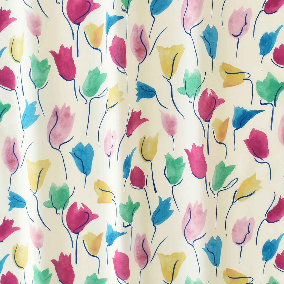 ミドルスケールの抽象的な花のデザイン「チューリップ・シャドー」は、アーカイブ作品から着想を得てスタジオにて水彩絵の具でペイントしなおされました。
