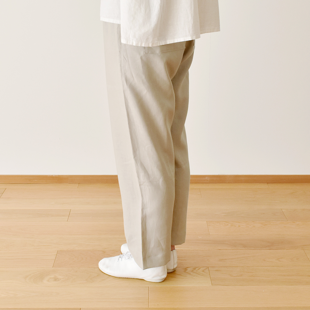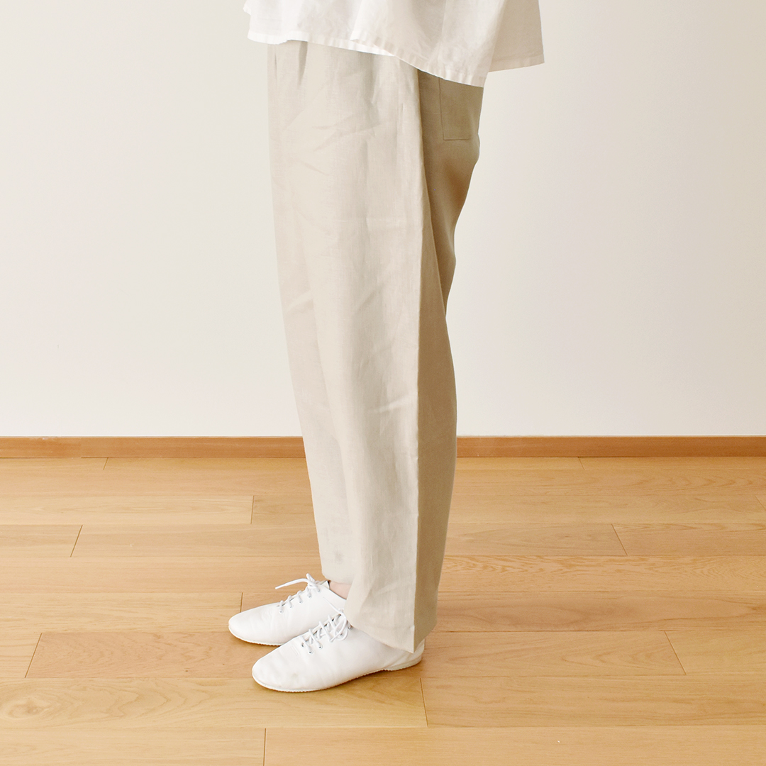 こちらの布をお買い上げのお客さまに「すっきりテーパードパンツ」のレシピをおつけします。(サンプル:ソイラテ) ※用尺 105cm幅×2.3m