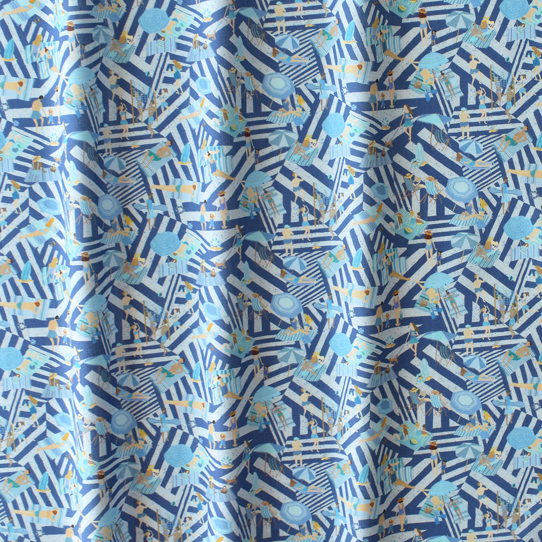 リバティのスタジオで手描きされた、遊び心あふれるカンバセーショナル・パターン「ショアライン」。細部まで描き込まれた数々のモチーフが、見る人を物語の中へと誘います。グレイソン・ペリーのセラミック作品に見られる社会的な物語性や、ミクストメディアを自在に取り入れる表現手法から着想を得て、英国の海辺で過ごす夏の、のびやかで気ままな空気感を描き出しています。浜辺では、砂浜でくつろいだり、遊びに興じたり、本を読む人々の姿が点在し、背景に配された大胆なストライプが、現代的なエッジを加えています。幾何学的なコラージュ効果が、全体にさりげない奥行きをもたらしています。