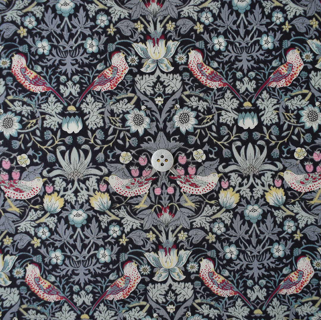 英国の思想家、詩人、デザイナー、作家、画家でデザイン史上に多大なる影響を与えた、ウィリアム・モリス。イチゴ泥棒という名前のこのデザインは、モリス自身がイチゴを育てようとしたときに、鳥に食べられてしまった経験からインスピレーションを得て1883年に制作されました。1979年、リバティ社が調度品のファブリックとしてプリントし、その後タナローン用に柄を縮小しデザインを調整。1995年リバティ社のクラシックコレクションに加入した以降、今でも不動の人気を誇っています。 -