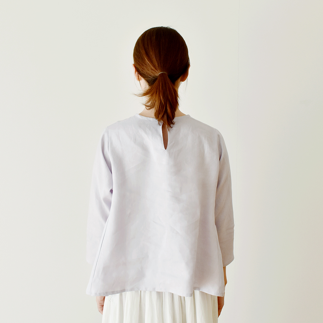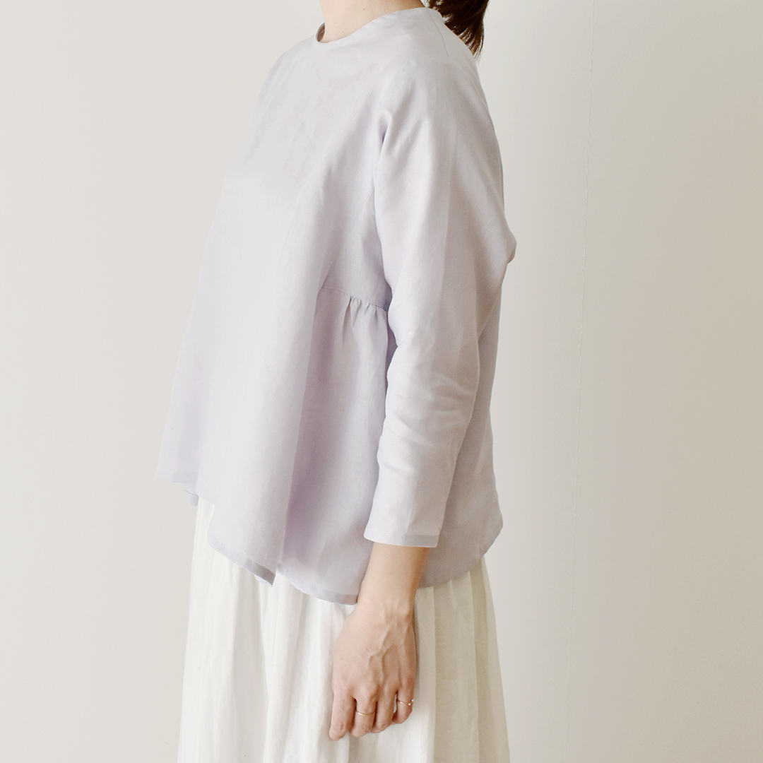 スモークライトラベンダー:『CHECK&STRIPE Sewing Diary in Paris パリのソーイングダイアリー』(世界文化社) サイドギャザーのワンピース(ブラウス丈にアレンジしています)