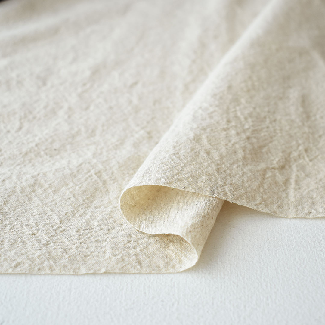 コットンとヨーロッパ産の上質なリネンを原料に、日本国内で紡績から織り上げまで丁寧に行い、生機も純国産のものを使用しています。リネンを高率で配合することで、やわらかな肌触りの中に、自然素材ならではのナチュラルな風合いと深みをプラスしました。