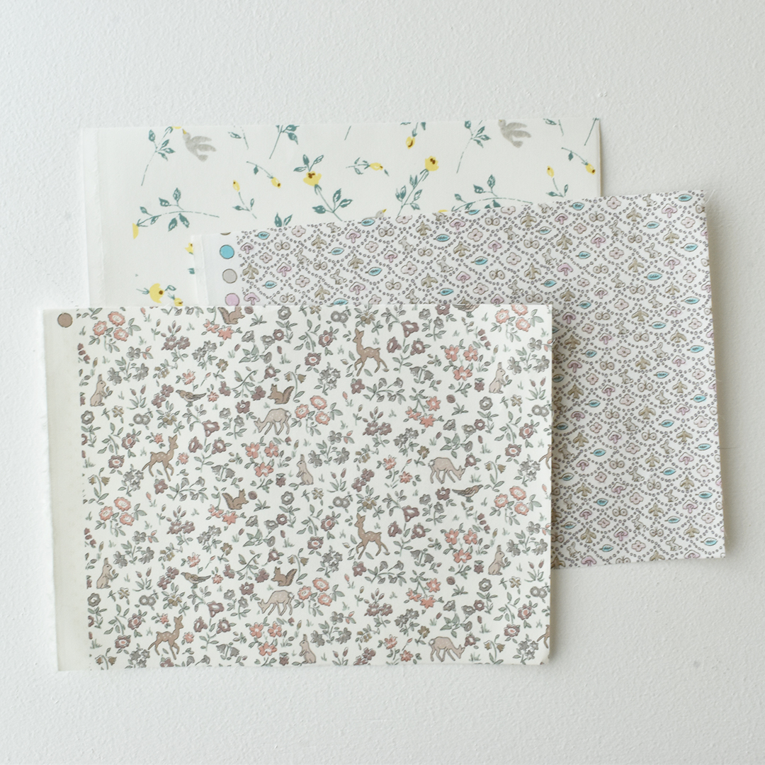 表面はリバティプリントの生地、裏面は白い紙が貼ってある、リバティプリントクラフトぺーパー。