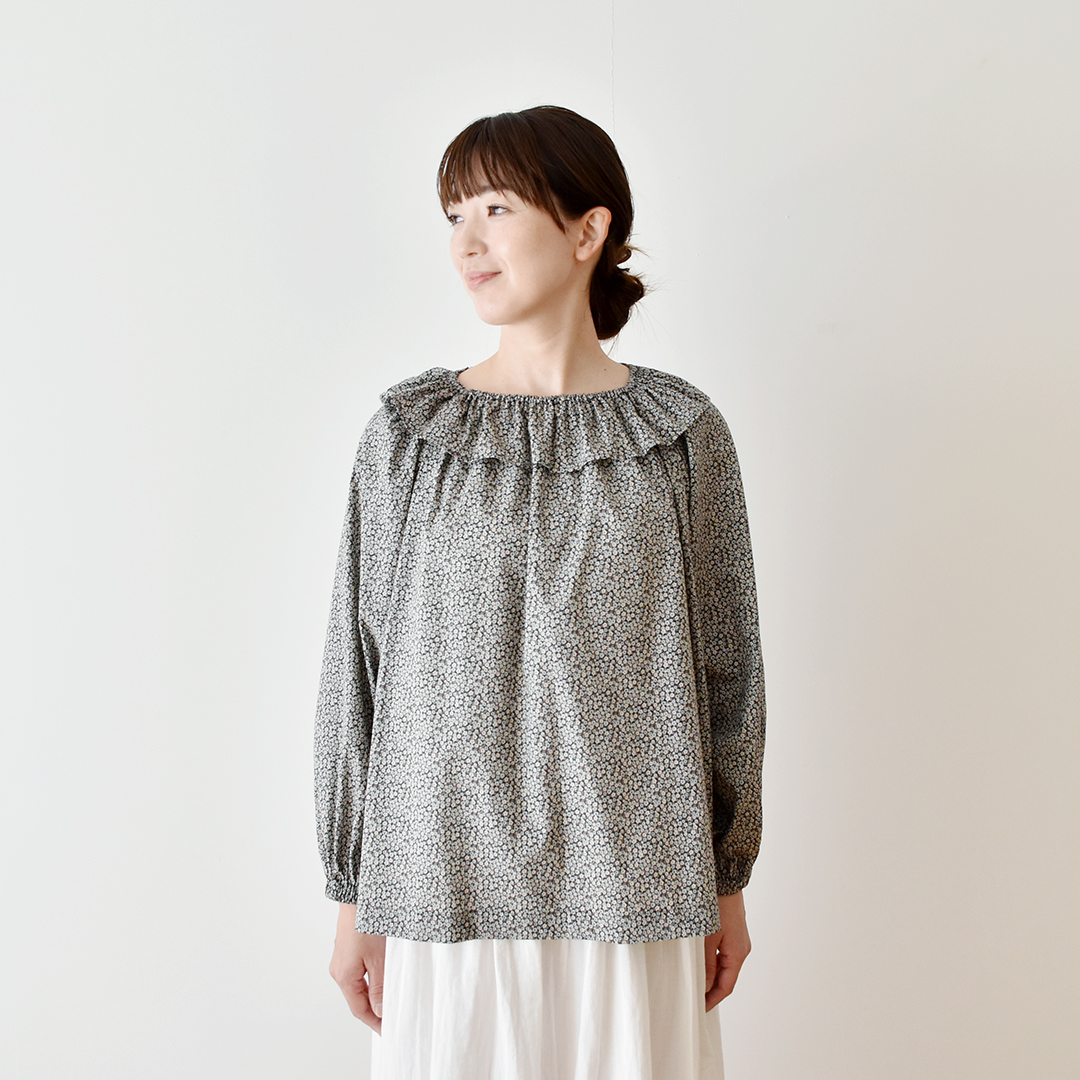こちらの布をお買い上げのお客さまに、フリル衿のブラウスのレシピをおつけいたします。オンラインでは初めてご紹介するレシピです。(サンプル:◎J26C(フレンチ系)) ※用尺:108cm幅×2.5m