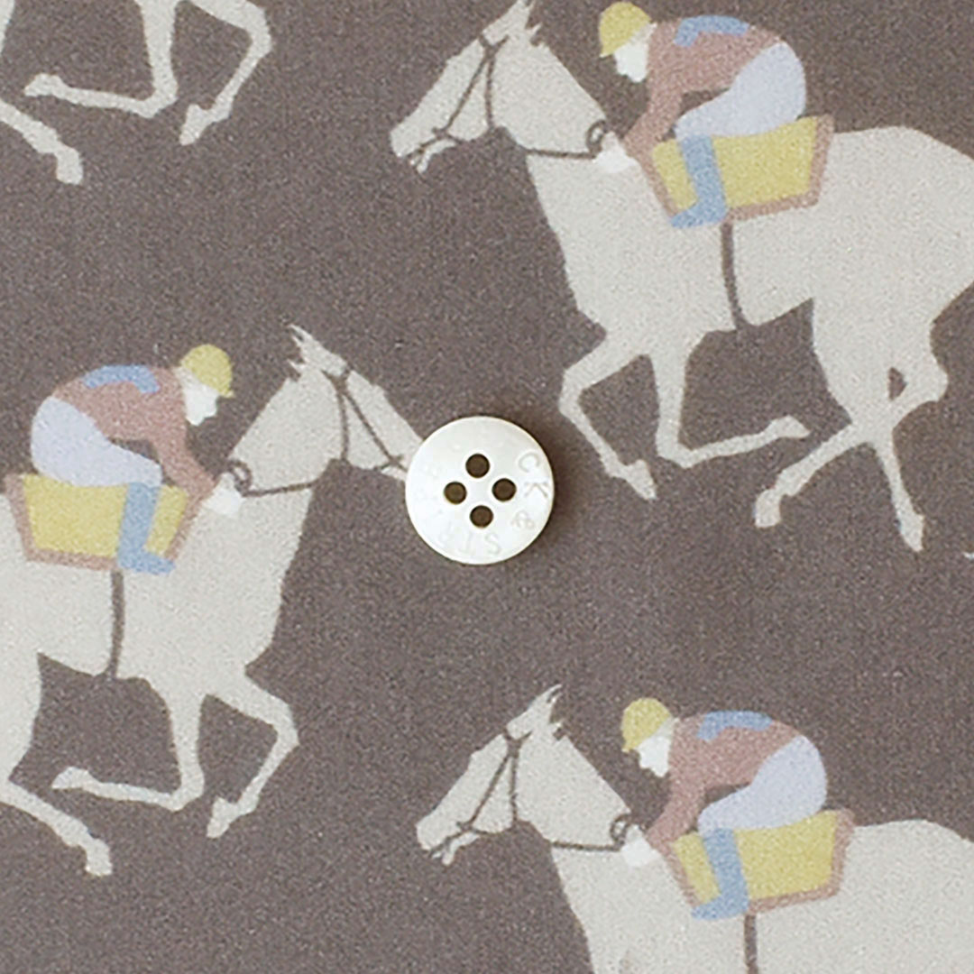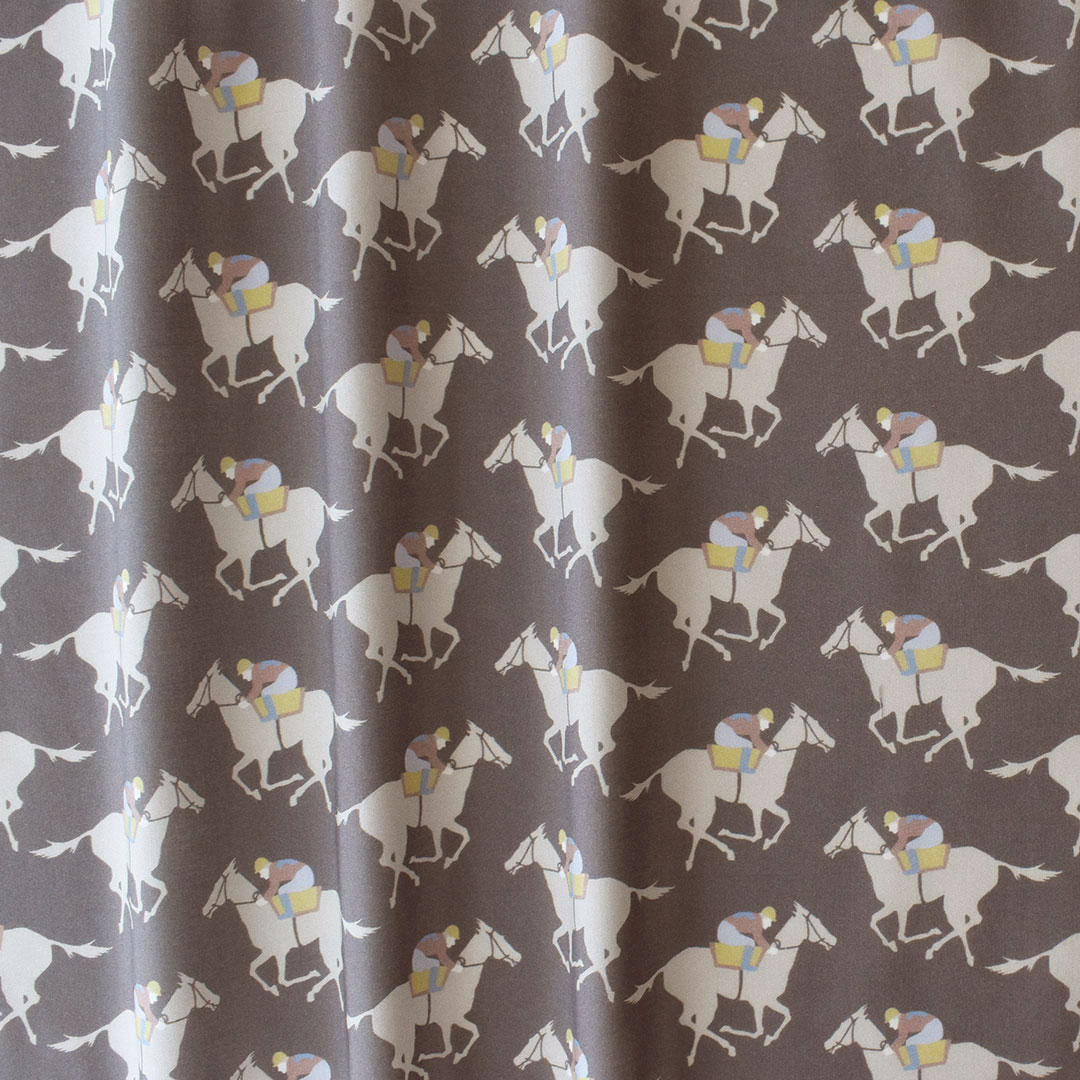もともとは1972年に印刷されたリバティのスカーフの一部として作られた、この魅力的なアーカイブデザインには、集中した騎手と共に駆け抜ける競走馬が描かれています。